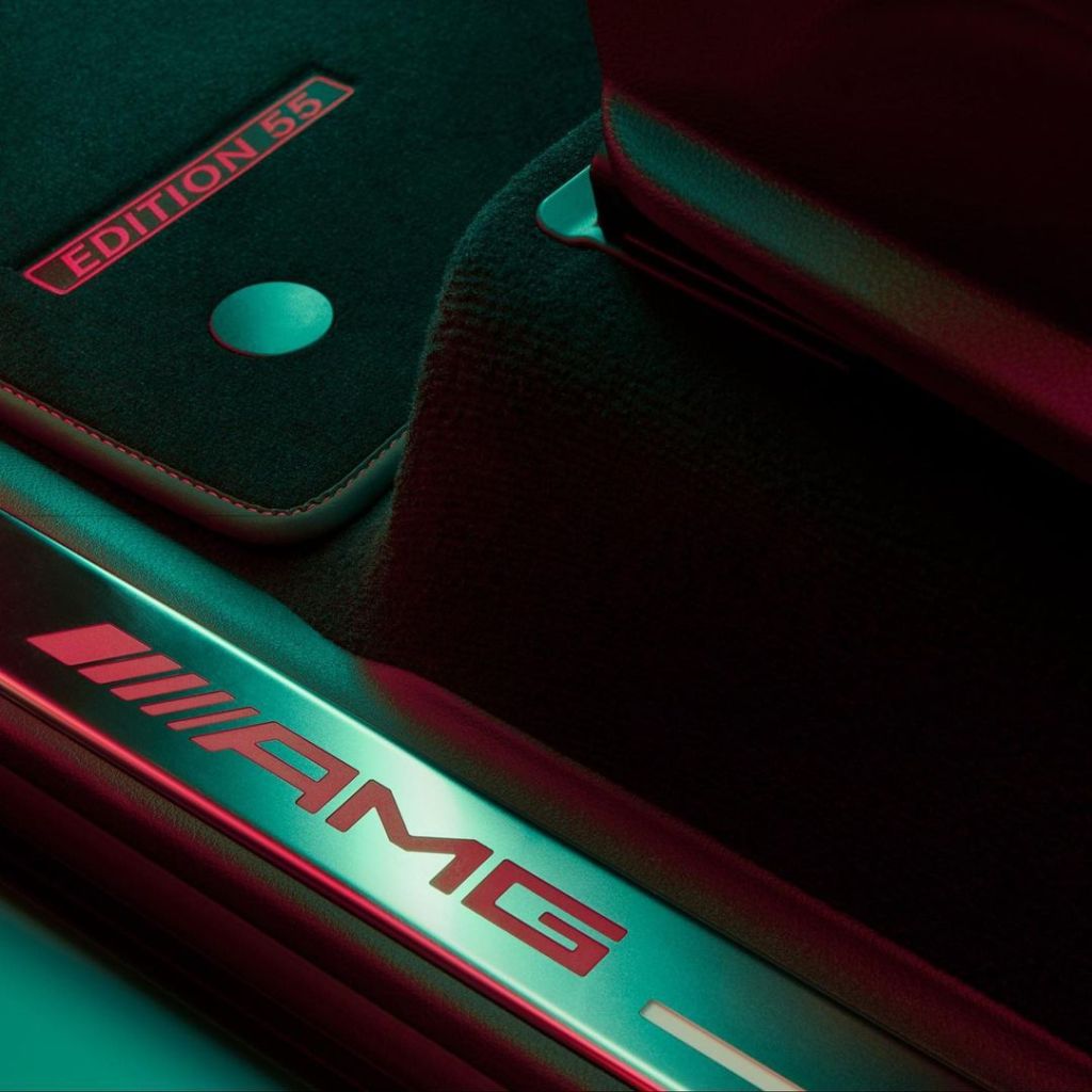 Los toques meticulosamente cuidados, como las letras AMG de unos umbrales de las puertas de acero inoxidable iluminados. Las alfombrillas también son exclusivas y lo mismo ocurre con el volante, recubierto de microfibra Dinamica y con la insignia “55 AMG” en la parte inferior del aro. Además, los asientos AMG en diseño específico están tapizados en Napa bicolor en rojo clásico/negro. El ambiente exclusivo del habitáculo se completa con molduras decorativas en carbono mate.