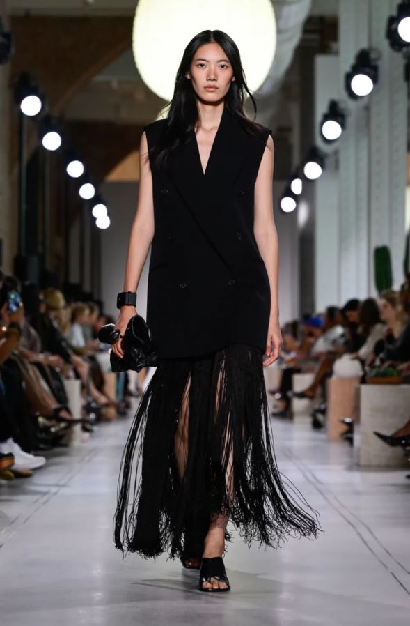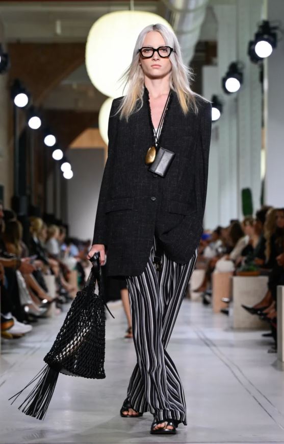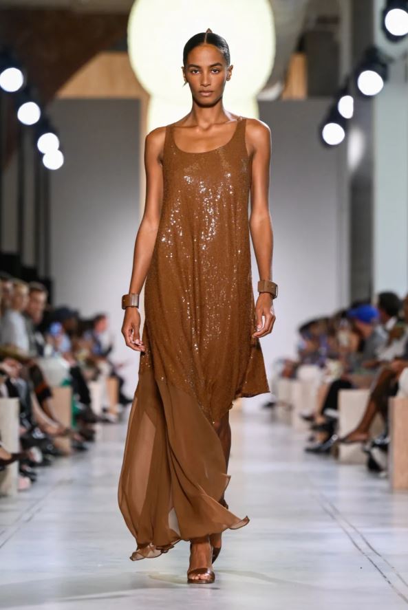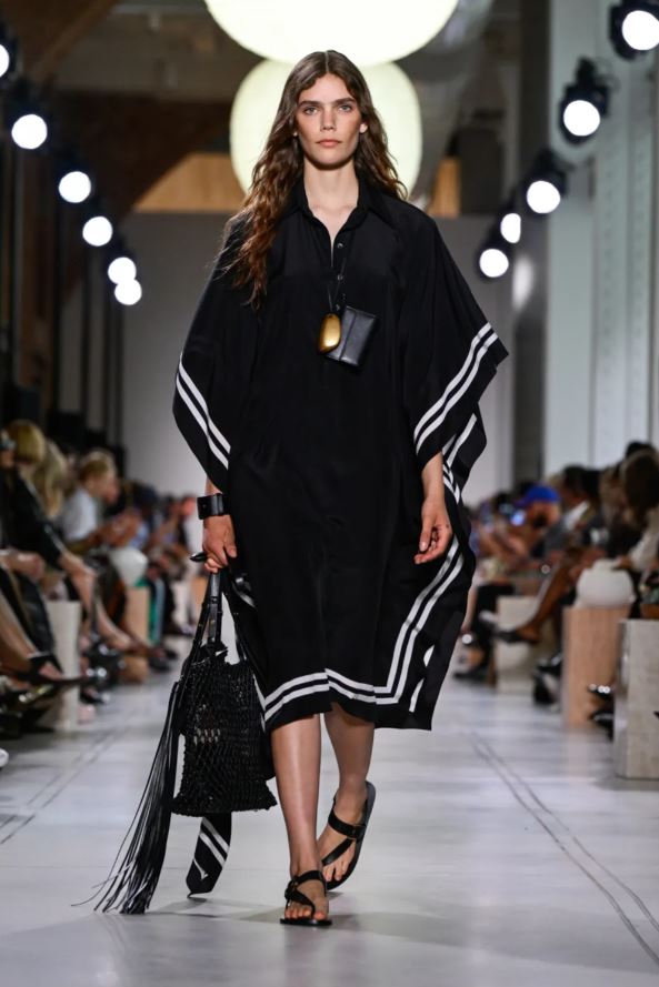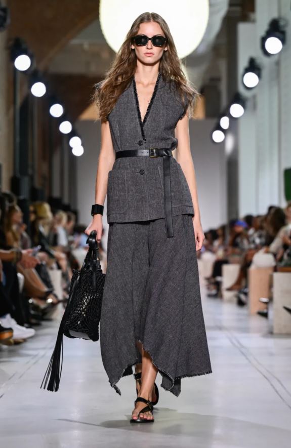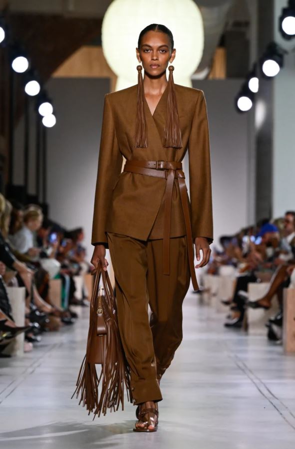 Michael Kors presentó conjuntos en café, negro y blanco con texturas, como pantalones harem transparentes o faldas con flecos, para añadir un toque de profundidad a la interpretación monocromática de la paleta primaveral.