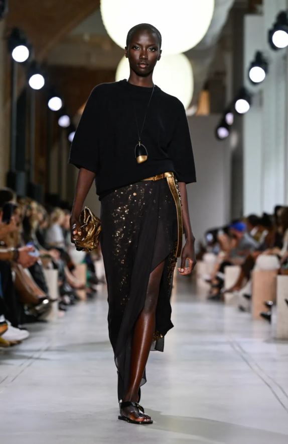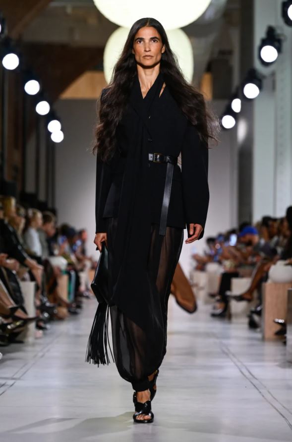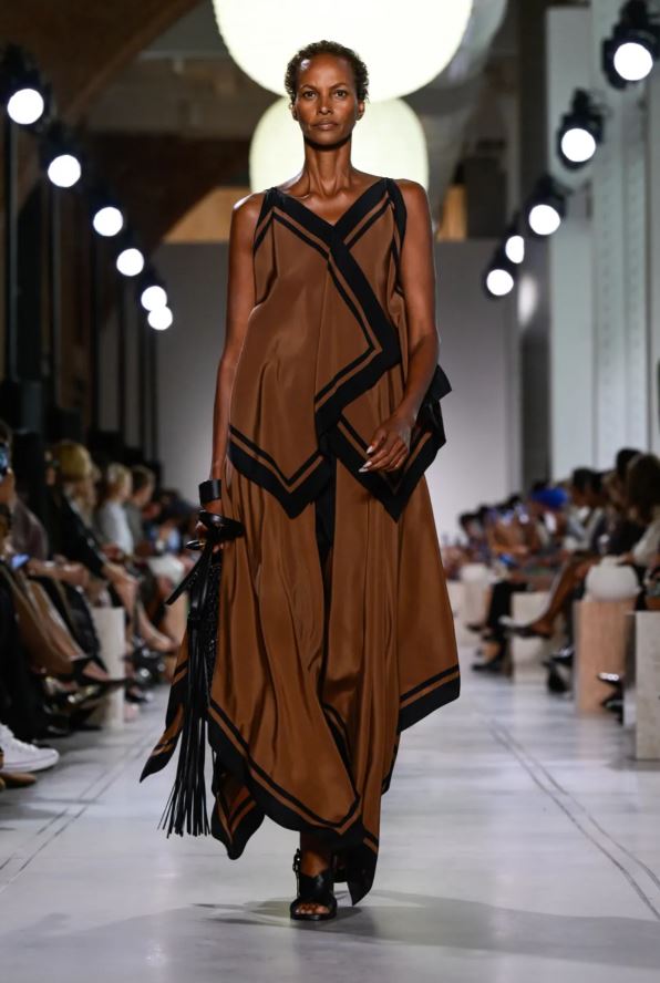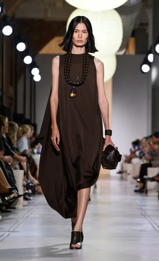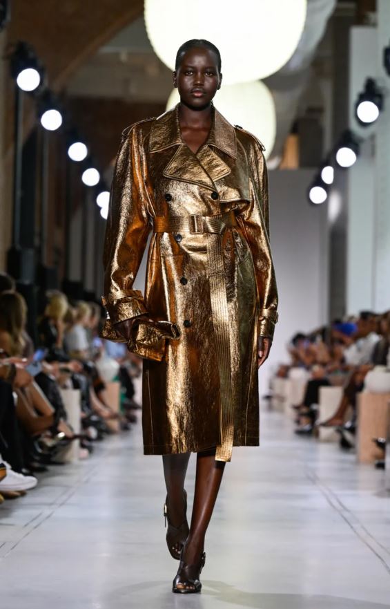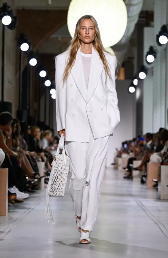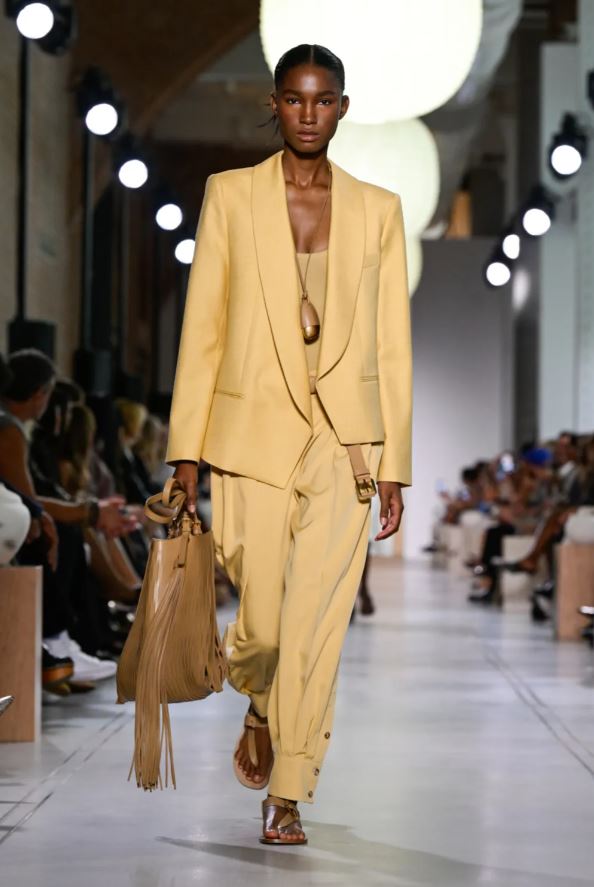 Michael Kors presentó conjuntos en café, negro y blanco con texturas, como pantalones harem transparentes o faldas con flecos, para añadir un toque de profundidad a la interpretación monocromática de la paleta primaveral.