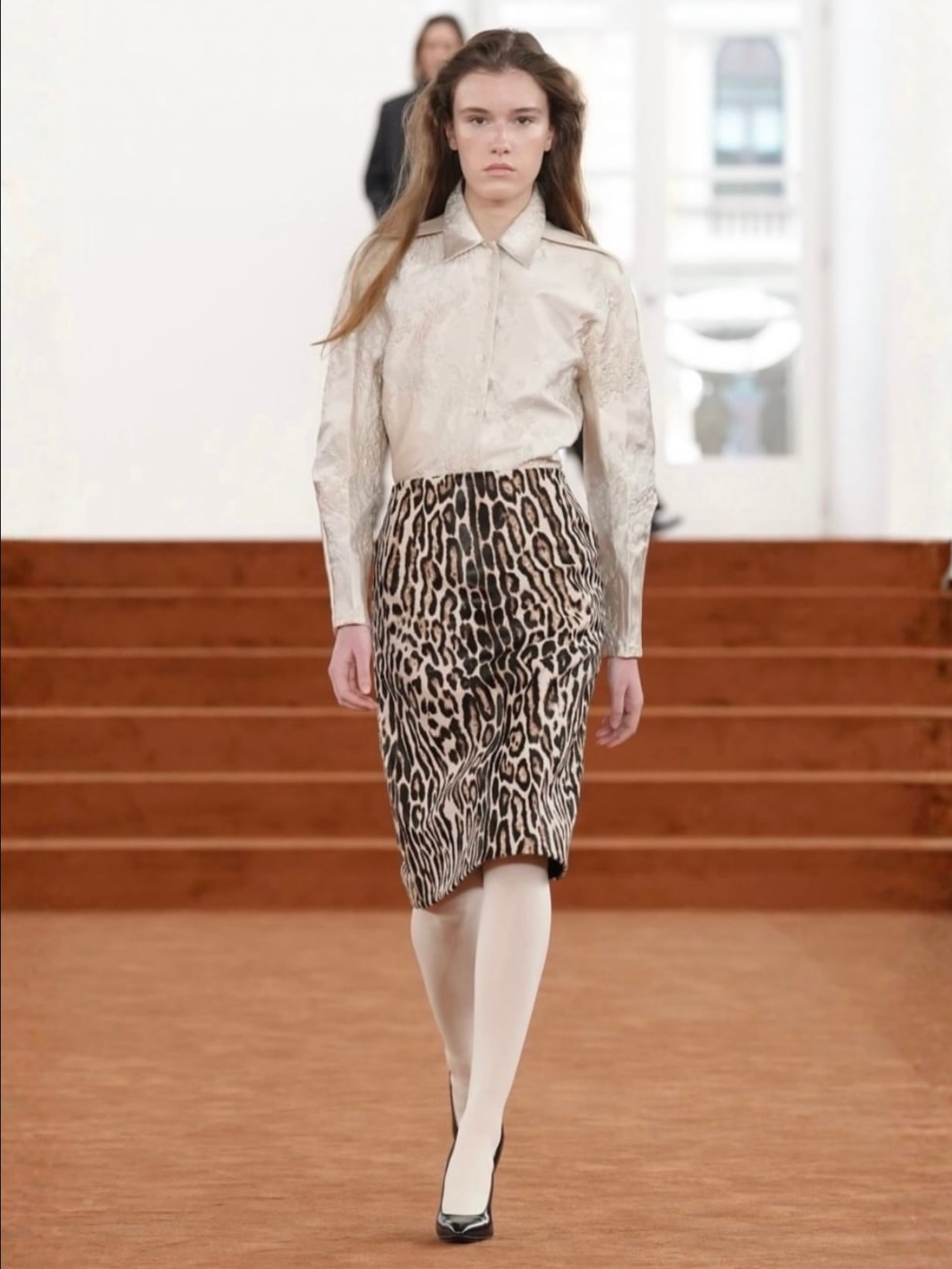 La estrella de la colección es una sastrería impecable, todo lo que define a esta temporada. Abrigos con cuellos que se deslizan hacia atrás, gabardinas y blazers. Las chaquetas “banana” fueron esenciales dentro de la colección. Faldas abiertas desde la cintura, abrigos con cortes en la espalda. Pero un highlight de esta colección, es el regreso del leopard print, presente en una falda recta midi.