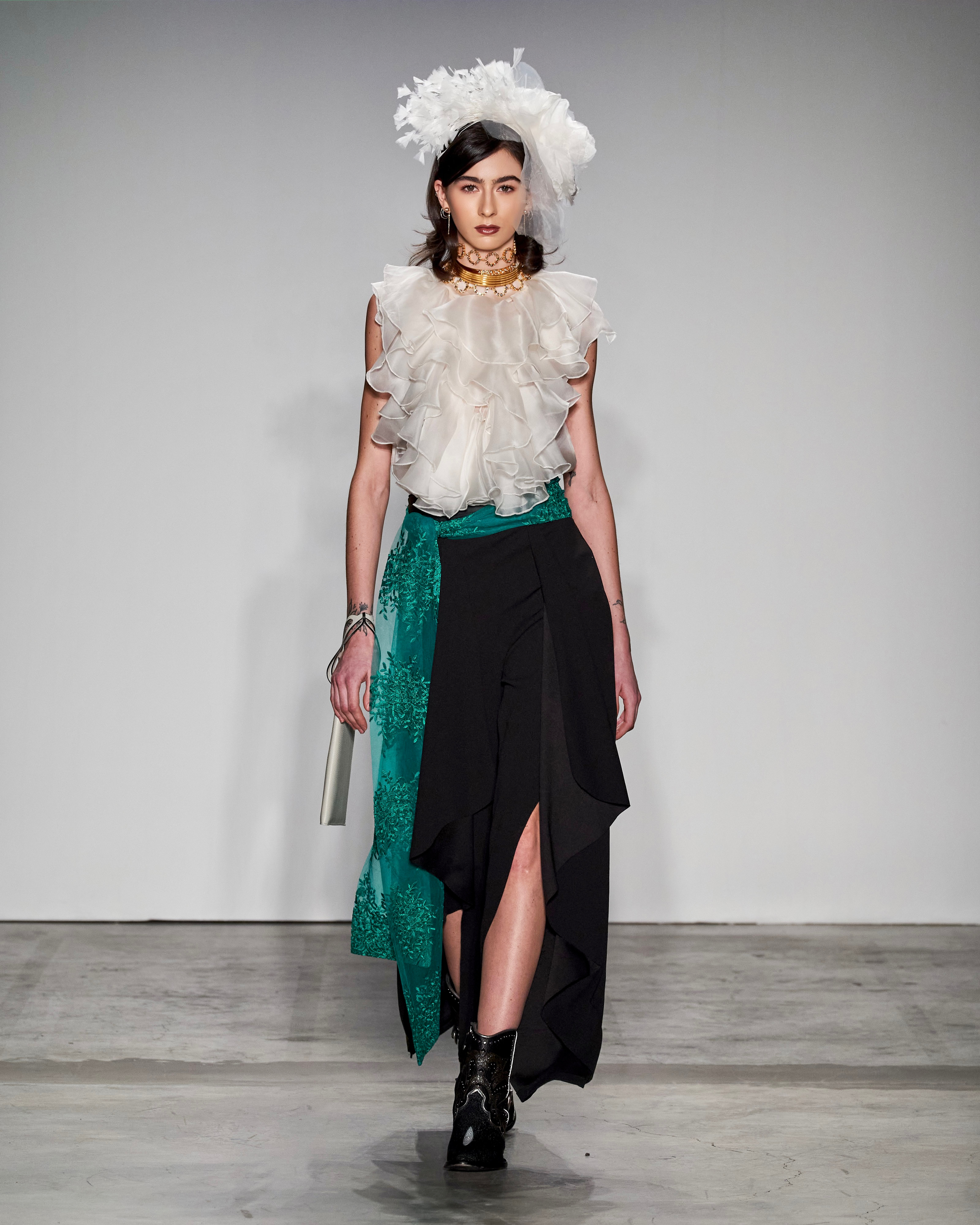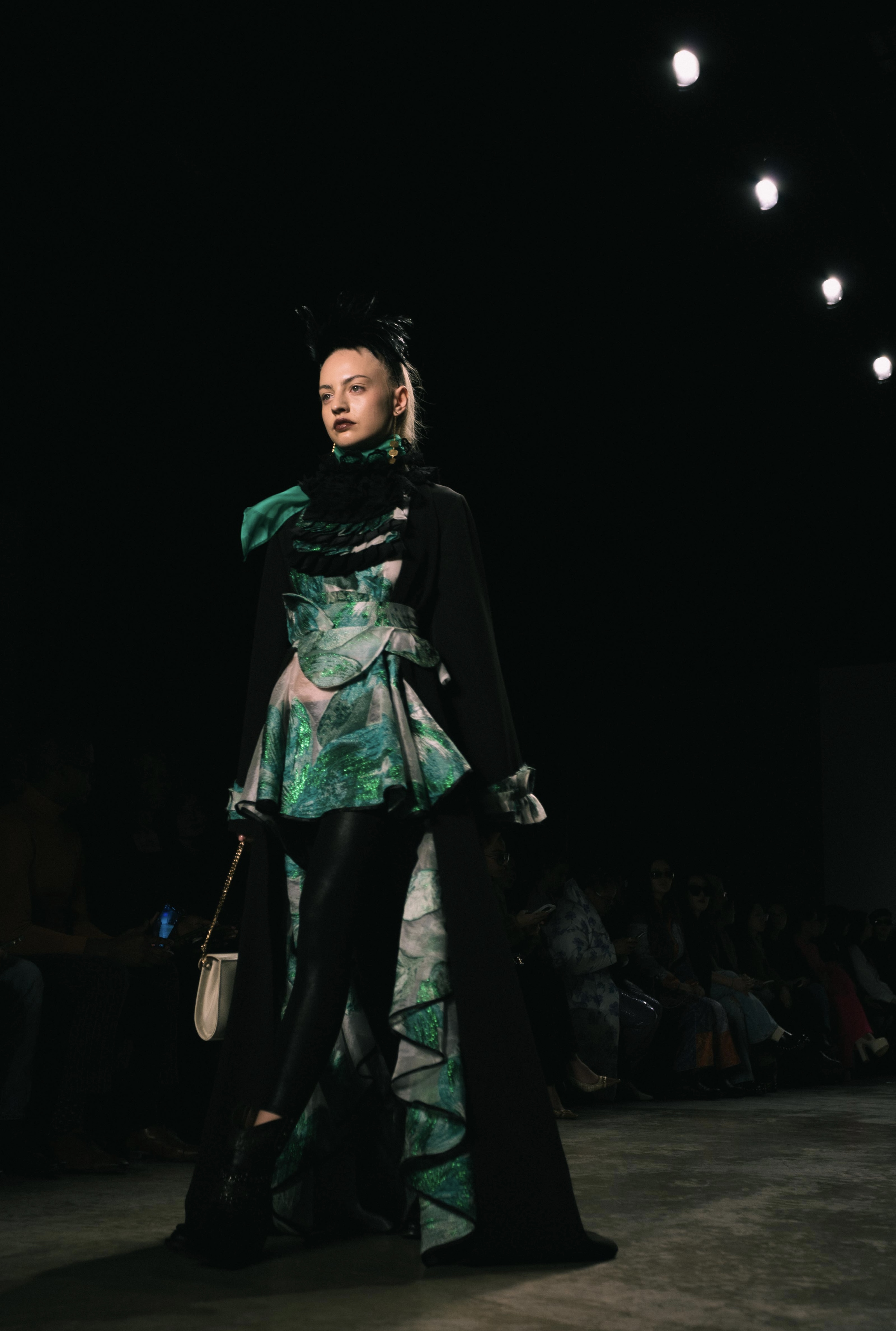 La colección contó con 12 looks que impresionaron a todos los asistentes. La base de la colección fueron los colores verde, negro y blanco; como parte de la moda que identifica a Jasive, se vio seda, olanes, encajes y mucho volumen con aires barrocos en el styling. Las pieles exóticas del calzado de Cuadra hicieron juego perfectamente con la colección y la joyería brillante, elegante y sofisticada de Elisheva and Constance; y como broche de oro para detallar, los bolsos y clutches de Illi México hicieron que las modelos se deslizaran por la pasarela de forma icónica.
