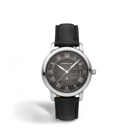 El reloj Montblanc Star Legacy Automatic Day & Date, un modelo clásico a la vez que contemporáneo, encarna el equilibrio entre dos identidades complementarias. El reloj presenta una esfera de color antracita con un motivo de estrella guilloché en expansión, números romanos rodiados y unas elegantes agujas en forma de hoja para la hora, los minutos, los segundos y la fecha. Cuenta con un movimiento automático MB24.28, una caja de 39 mm de acero inoxidable en forma de guijarro y un reverso de caja abierto que revela el peso oscilante en el interior. El reloj se completa con una correa intercambiable en piel de becerro, inspirada en la forma puntiaguda de un plumín.