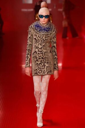 Durante el desfile de Valentino para la temporada otoño-invierno 2025/2026, Kai se lució con un minivestido de manga larga con estampado de leopardo y cuello de plumas. Complementó su atuendo con medias de encaje transparente, sandalias blancas de tacón, lentes de sol y un tocado de encaje que recogía su melena rubia.