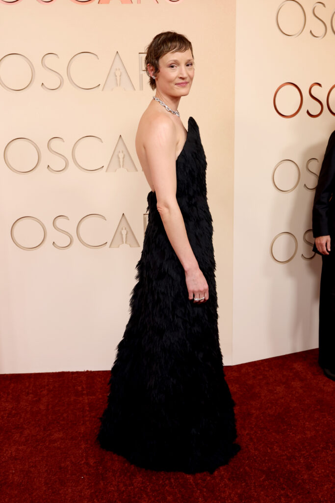 La actriz deslumbra con un sofisticado diseño negro de Gucci, adornado con plumas en el escote y hombros caídos.