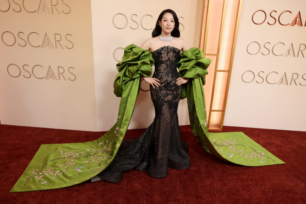La actriz reafirma que el verde es tendencia con espectaculares mangas de volumen extremo y motivos florales, que enmarcan un vestido sirena de encaje negro con intrincados detalles brillantes.