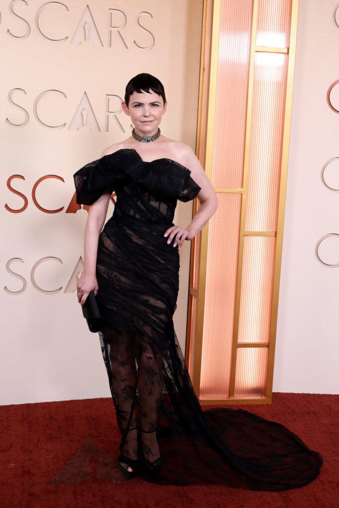 La actriz de “Zootopia” luce un sofisticado vestido de encaje negro, caracterizado por sus transparencias, un llamativo volante en el escote y una elegante gargantilla rígida.