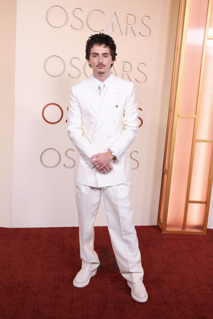 El actor deslumbra con un impecable traje blanco de doble botonadura firmado por Givenchy, logrando un look monocromático de alta costura que complementa con múltiples anillos y un broche.