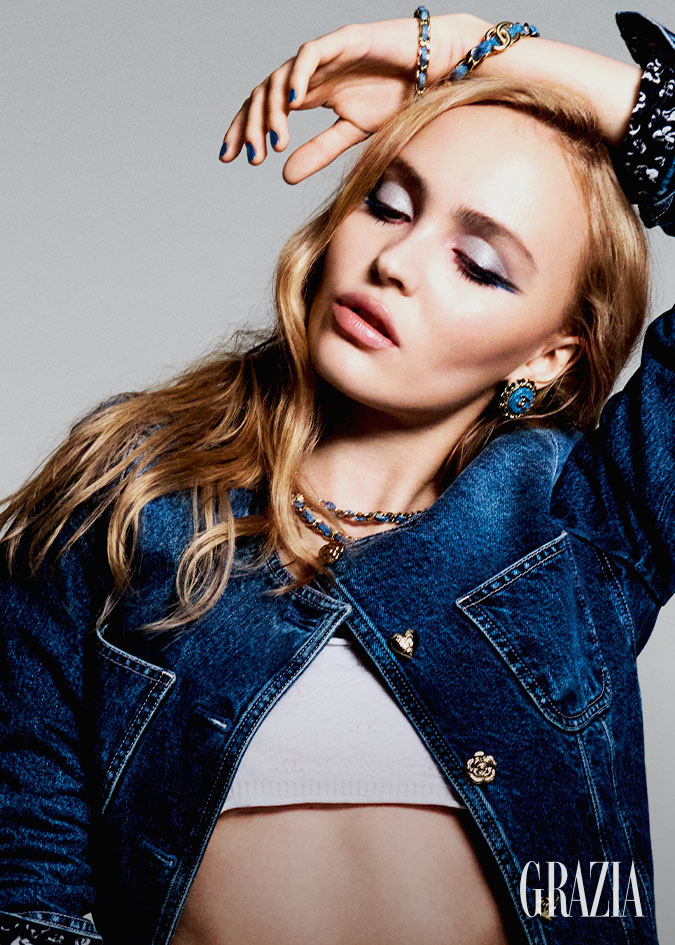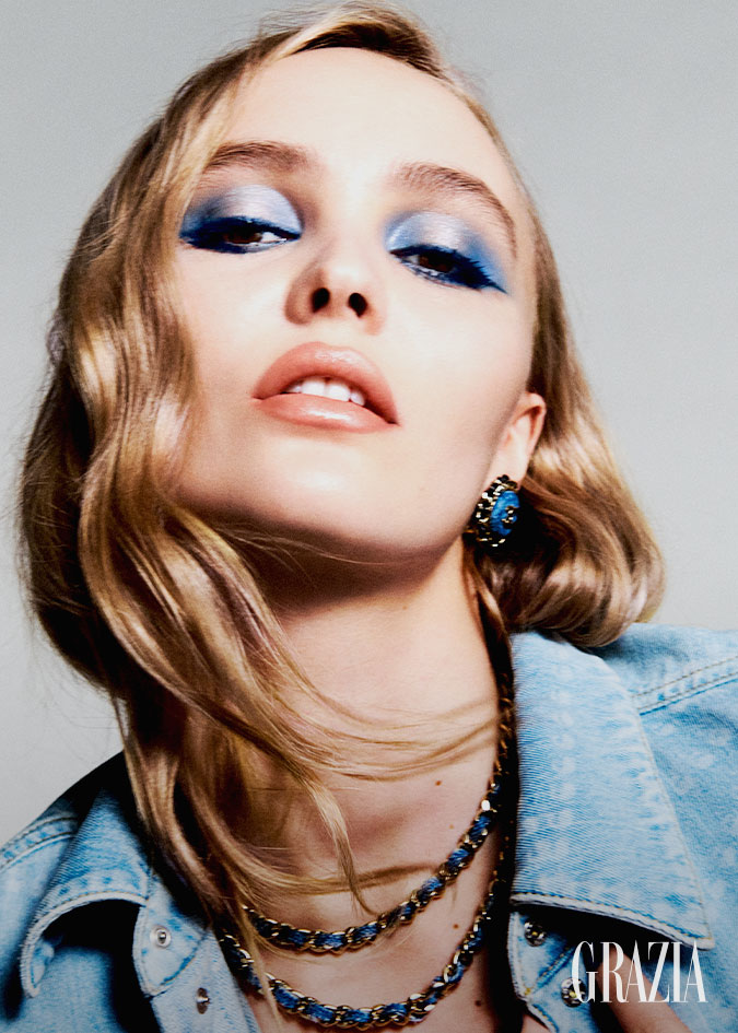 ILUMINA DE AZUL Lily-Rose Depp usa maquillaje colección COCO DENIM, Precision Powder Brush No. 107, sombras Les 4 Ombres Coco Jean Exclusive Creation, brocha Rounded Eyeshadow Brush No. 204, Stylo Yeux Waterproof 38 Bleu Métal y Eye-countouring Brush No. 203, mascara Noir Allure 97 Indigo, labios Rouge Coco Flash 286 Washed Beige, mani LeVernis 419 Légende, todo Chanel. Chamarra, collares y aretes, Chanel.