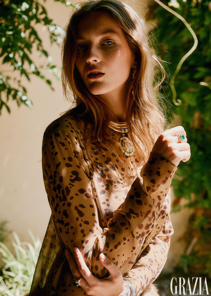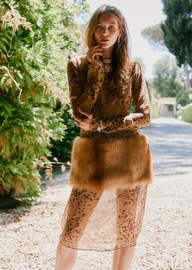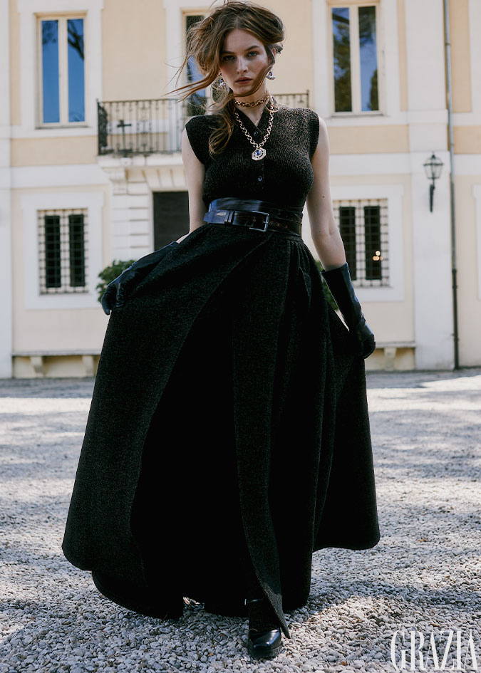 todo alta joyería Polychroma, Bvlgari. Vestido, pantalón, cinturón, guantes en piel y botas, Max Mara.