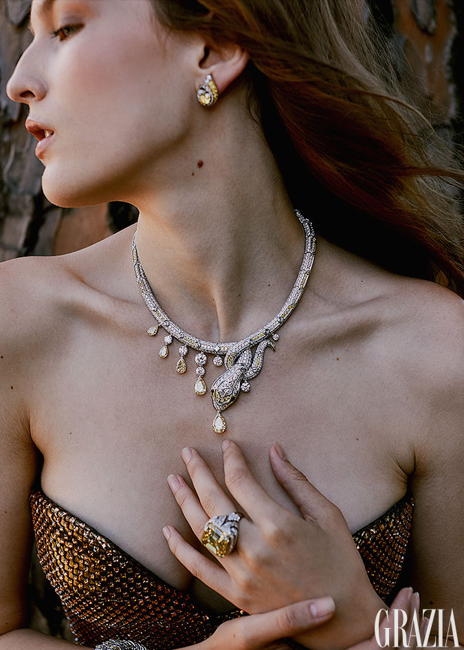 en oro blanco diamantes incoloros y amarillos, todo alta joyería Polychroma, Bvlgari.