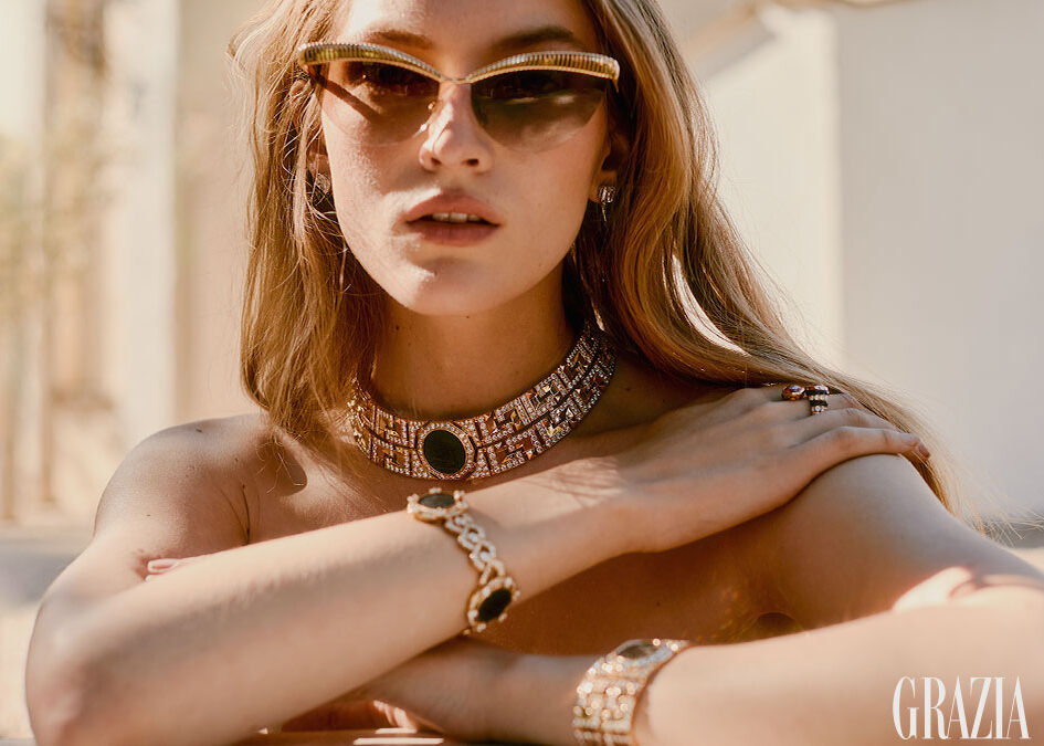 Collar, brazalete y reloj, Monete en oro amarillo y diamantes, aretes en diamantes corte cojín, anillo en oro rosa, diamantes, ónix y rubí, lentes de sol tubogas en oro amarillo, todo alta joyería Polychroma, Bvlgari.