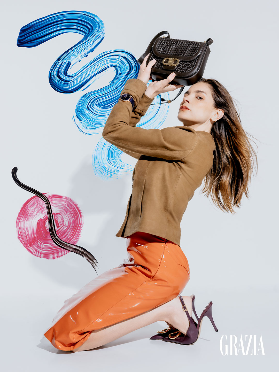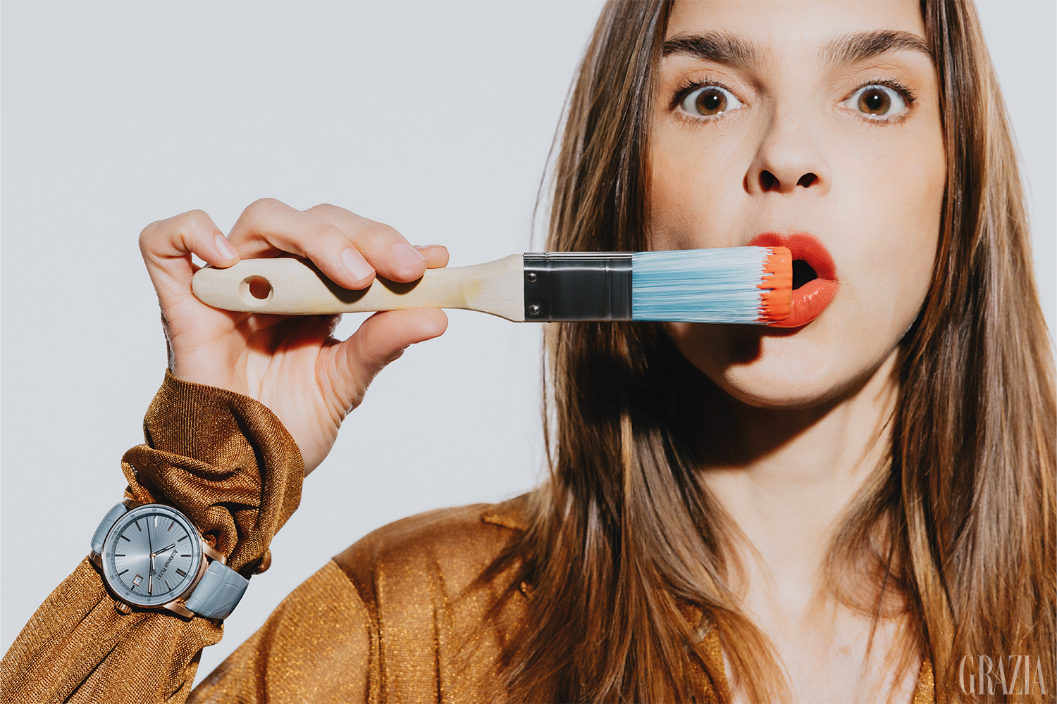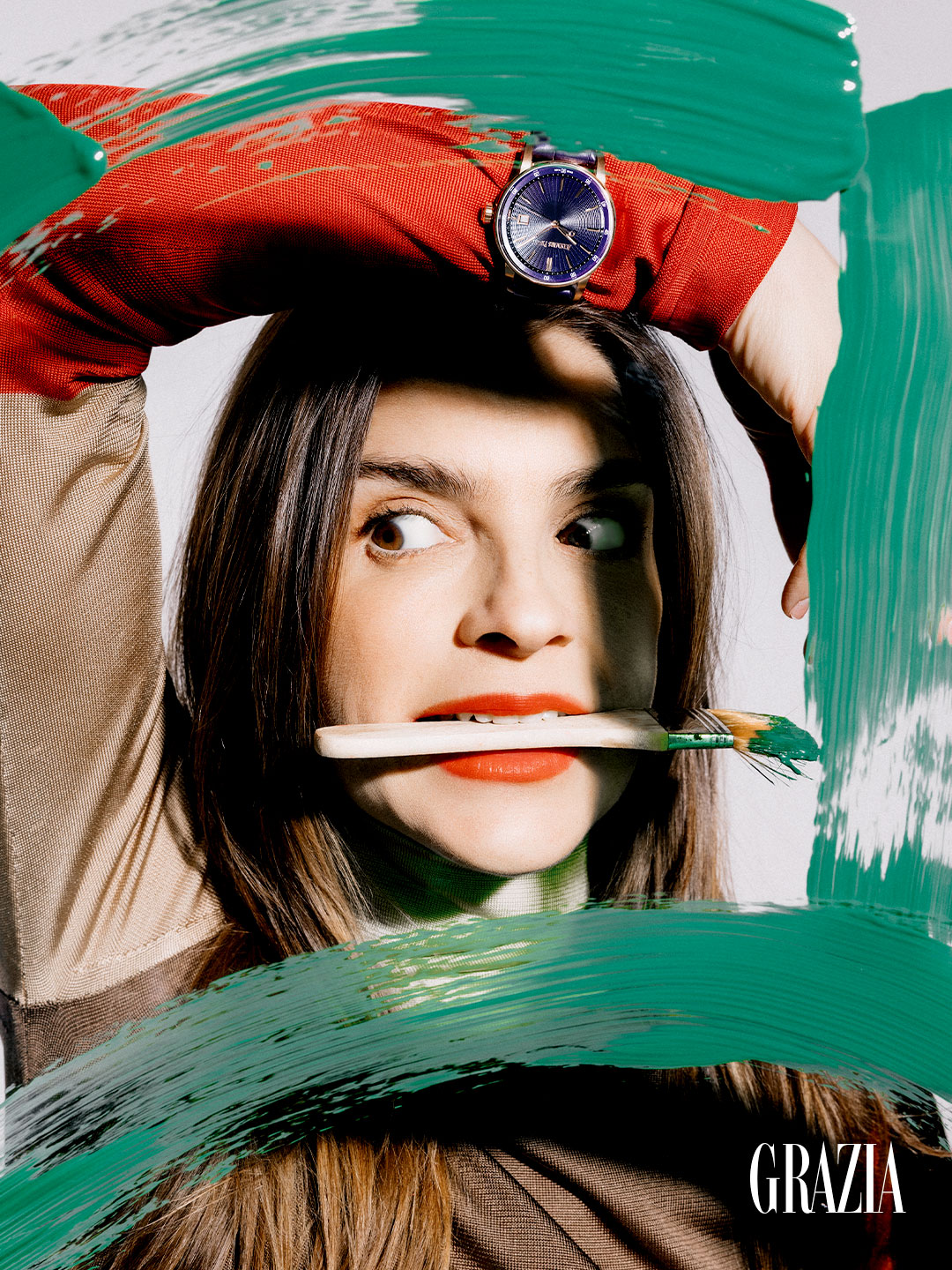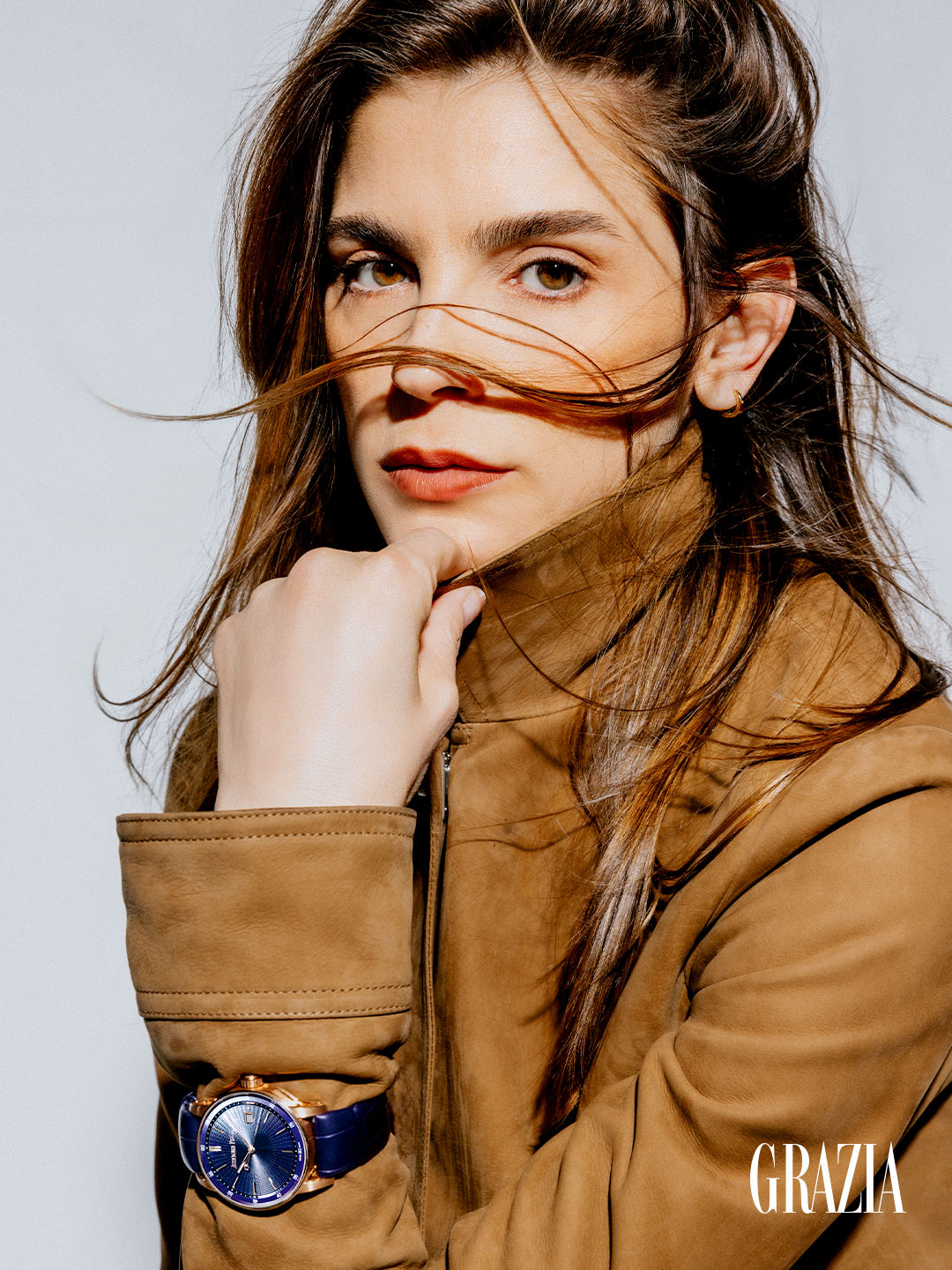 Puntualísima y soportando el frente frío por el que atravesaba la Ciudad de México, más el frío natural del estudio, Irene Azuela es un torbellino de energía, luz y profesionalismo. No importó la desvelada del día anterior, que valió toda la pena por la cena deliciosa que disfrutamos. Irene está lista para entrar en su mejor versión y dedicarle a GRAZIA buena parte de su día.