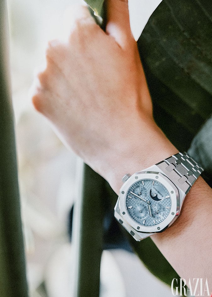 Reloj Royal Oak calendario perpetuo 38 mm, automático, Audemars Piguet. Vestido, Louis Vuitton.