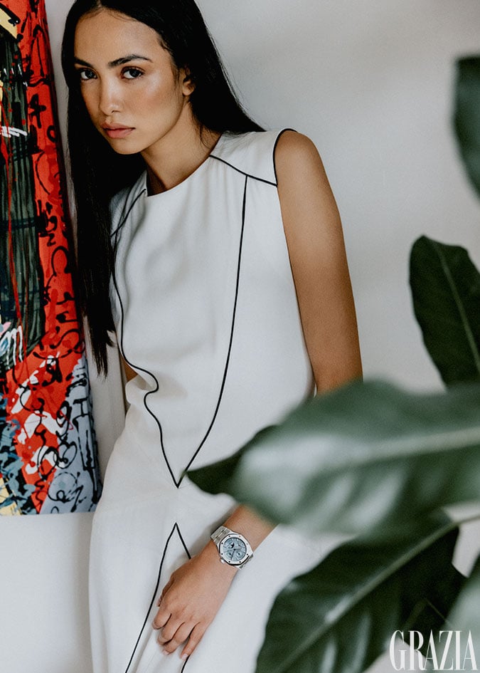 38 mm, automático, Audemars Piguet. Abrigo en lana, top y falda en seda y encaje, mules, Gucci.