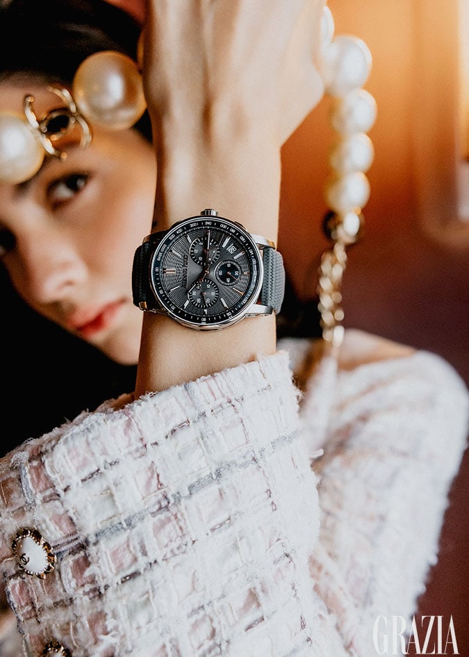 by Audemars Piguet con cronógrafo automático, 41 mm, Audemars Piguet. Saco y falda en terciopelo, blusa