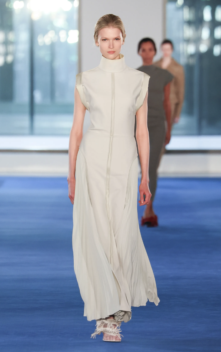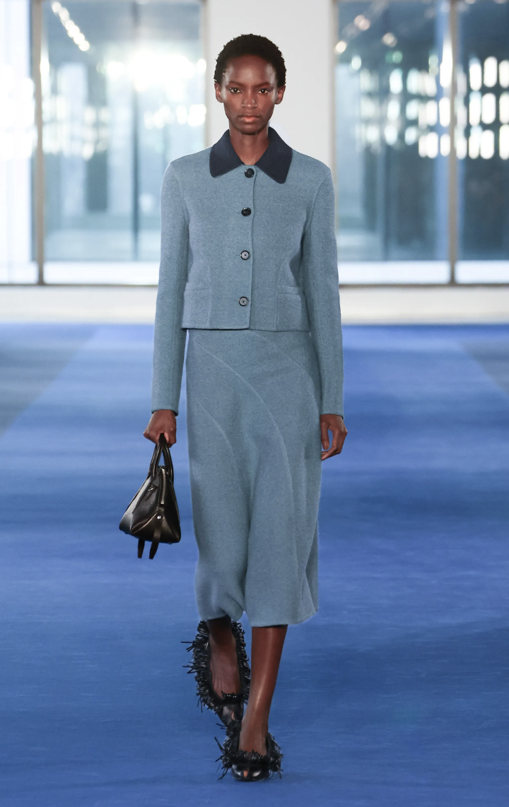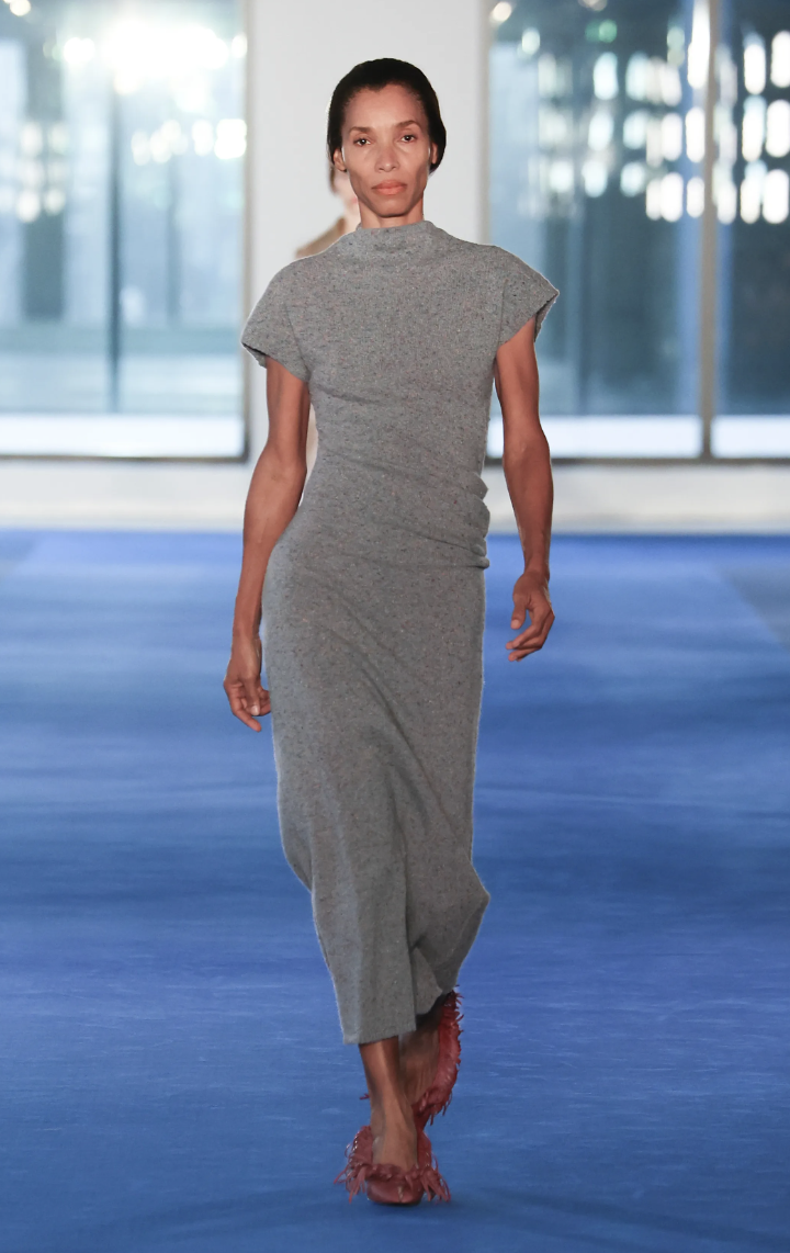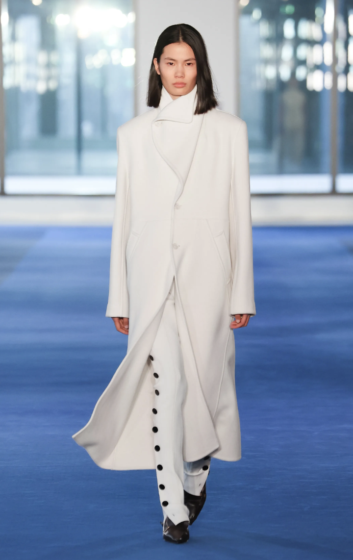 El desfile abrió con un vestido sin mangas de silueta escultórica, cuya falda redondeada evocaba la arquitectura característica de la marca. Sin embargo, el movimiento era más fluido, menos severo. A partir de ahí, la colección desplegó abrigos envolventes de hombros suavizados, trajes de sastrería depurada y vestidos largos que insinuaban el cuerpo con discreción. La construcción continuó siendo rigurosa, pero con una sensación más humana.