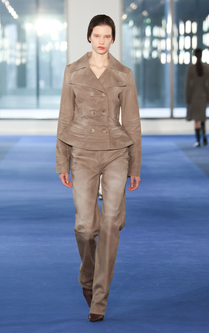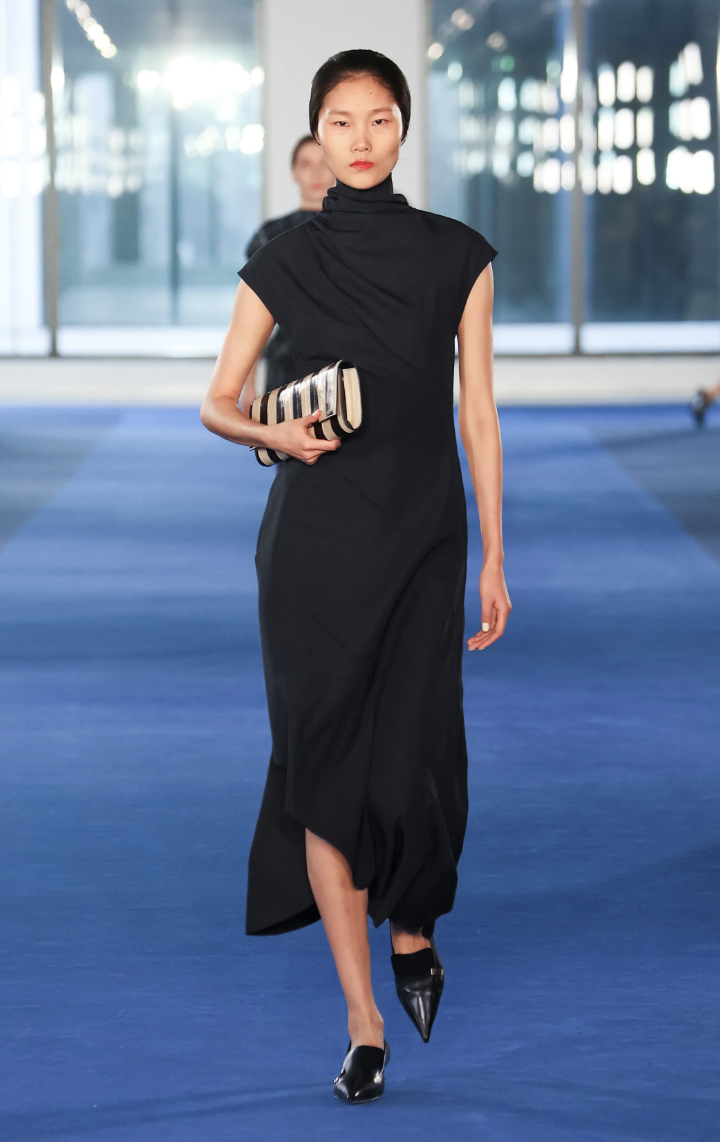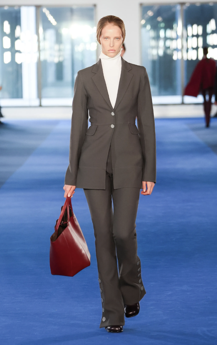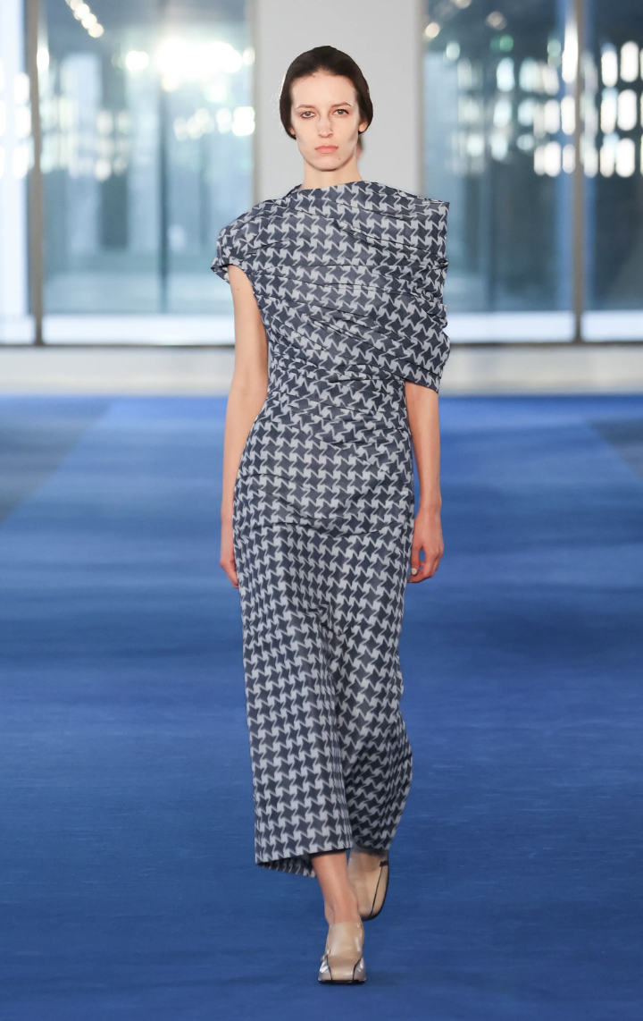 El desfile abrió con un vestido sin mangas de silueta escultórica, cuya falda redondeada evocaba la arquitectura característica de la marca. Sin embargo, el movimiento era más fluido, menos severo. A partir de ahí, la colección desplegó abrigos envolventes de hombros suavizados, trajes de sastrería depurada y vestidos largos que insinuaban el cuerpo con discreción. La construcción continuó siendo rigurosa, pero con una sensación más humana.