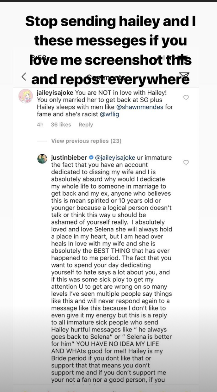 Y si este drama no era suficiente, el cantante también expresó que ya había tenido suficiente con el bullying que su esposa está recibiendo en torno al tema de Selena Gomez. Para hacerlo público, Justin respondió a un usuario en Instagram y destacó: “[…] amó y amare a Selena y siempre tendrá un lugar en mi corazón, pero estoy loco por mi esposa y es la mejor cosa que me ha pasado en la vida”. Agregó que las personas que continúen hiriendo a Hailey con comentarios de ese tipo —“Selena es mejor para él”—, no son verdaderos fanáticos ni buenas personas.