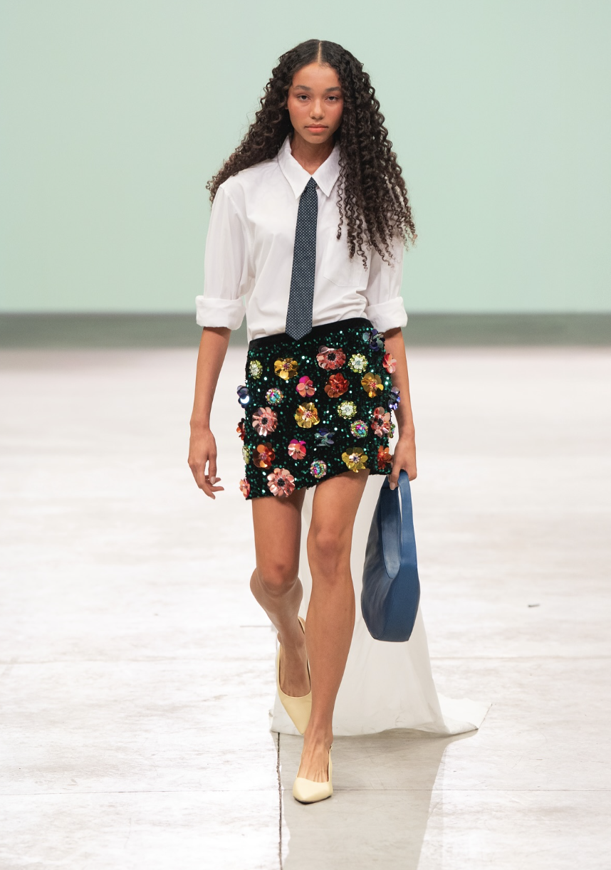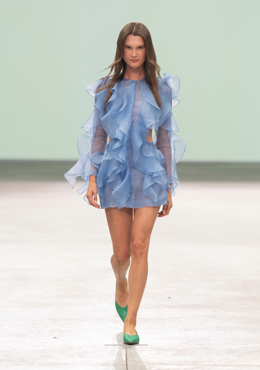 Esta temporada, la diseñadora llevó su visión a un nuevo nivel. Su pasarela fue un recorrido sensorial por los contrastes de la capital mexicana: texturas que evocan la arquitectura moderna, tonos tierra que remiten al concreto y destellos metálicos que capturan la energía de la urbe. Las piezas, llenas de movimiento y estructura, celebran la libertad de ser, de vestir y de sentir.