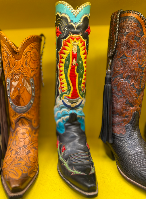 La devoción por la Virgen de Guadalupe se hace presente en varios rincones, reflejando esa mezcla única de tradición y fe que también forma parte del alma mexicana del lugar y de la biculturalidad que representa El Paso, Texas. En otra pared, una galería de fotografías muestra a artistas nacionales e internacionales que han pedido sus botas personalizadas y han dejado mensajes dedicados a Nevena y su equipo.
