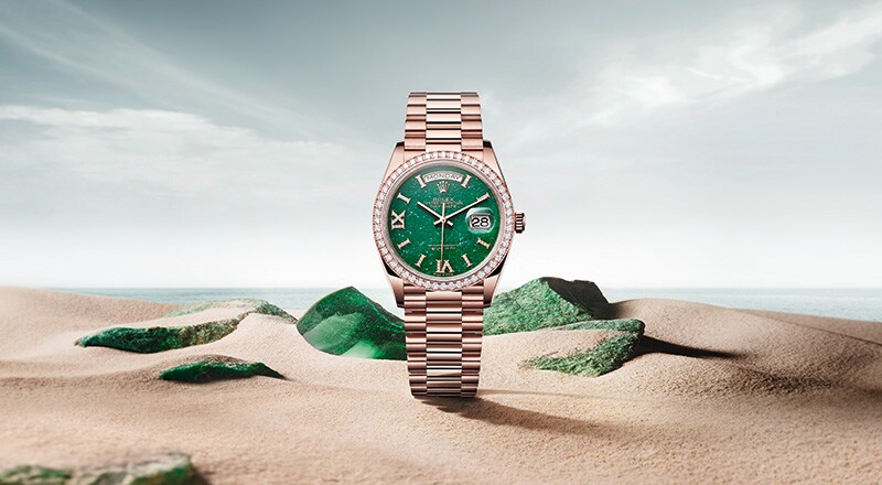 El Oyster Perpetual Day-Date 36 se propone con luminosas esferas en piedra ornamental cuyas tonalidades tornasoladas evocan la atmósfera de las costas mediterráneas. La esfera está tallada en venturina verde en la primera modalidad presentada —realizada en oro Everose de 18 quilates—, en cornalina en la segunda —fabricada en oro amarillo de 18 quilates— y en turquesa en la tercera, que es de oro blanco de 18 quilates.