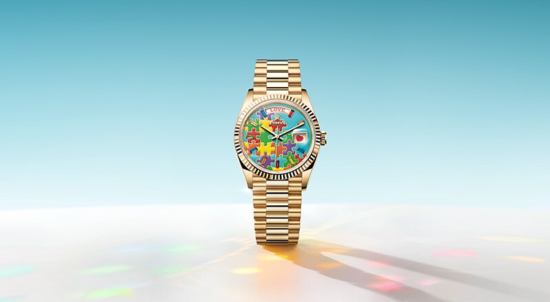 Rolex reformula el Oyster Perpetual Day-Date 36 con creatividad y una pizca de osadía: tres modalidades inéditas, fabricadas en oro amarillo, blanco o Everose de 18 quilates, muestran cada día una palabra clave inspiradora en inglés en la ventana situada en la posición de las 12 h y un emoji exclusivo en la de las 3 h. Su esfera, realizada en esmalte champlevé, luce un motivo decorativo basado en un puzzle y diez zafiros talla baguette de seis tonalidades diferentes a modo de índices.