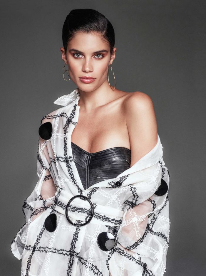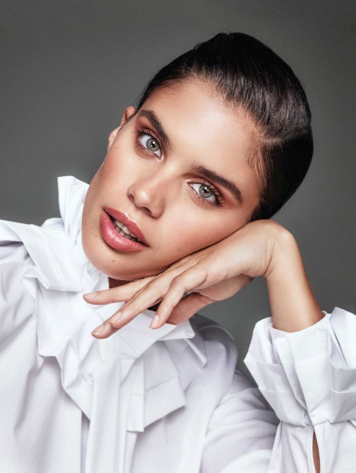 La modelo portuguesa Sara Sampaio, de 25 años. Aquí lleva una camisa blanca en popelina con cuello tipo lechuguilla y nudo en la parte delantera, Chanel.