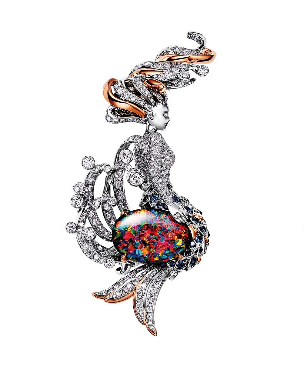 El surrealismo de la naturaleza del océano se abre camino con Urchin, una reinterpretación del erizo de mar en donde incorporan detalles como el esmalte paillonné —una impresionante técnica artesanal usada en el siglo XIX— que da como resultado resplandor y texturas únicos. La mítica Mermaid también roba cámara y bajo la visión de Verdeille nos presentan un broche en platino, oro rosa, diamantes y un ópalo negro de más de 10 quilates que muestra