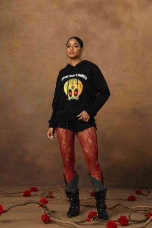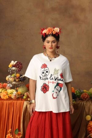 Además de playeras y sudaderas con ilustraciones únicas, la colección incluye accesorios como aretes, pines, bolsas y un reboso. También hay artículos pensados para el día a día, como un mantel y un camino de mesa que complementan el Altar de Muertos y las decoraciones de la temporada, así como un termo y una funda para celular que permiten llevar a la artista más allá de los atuendos.