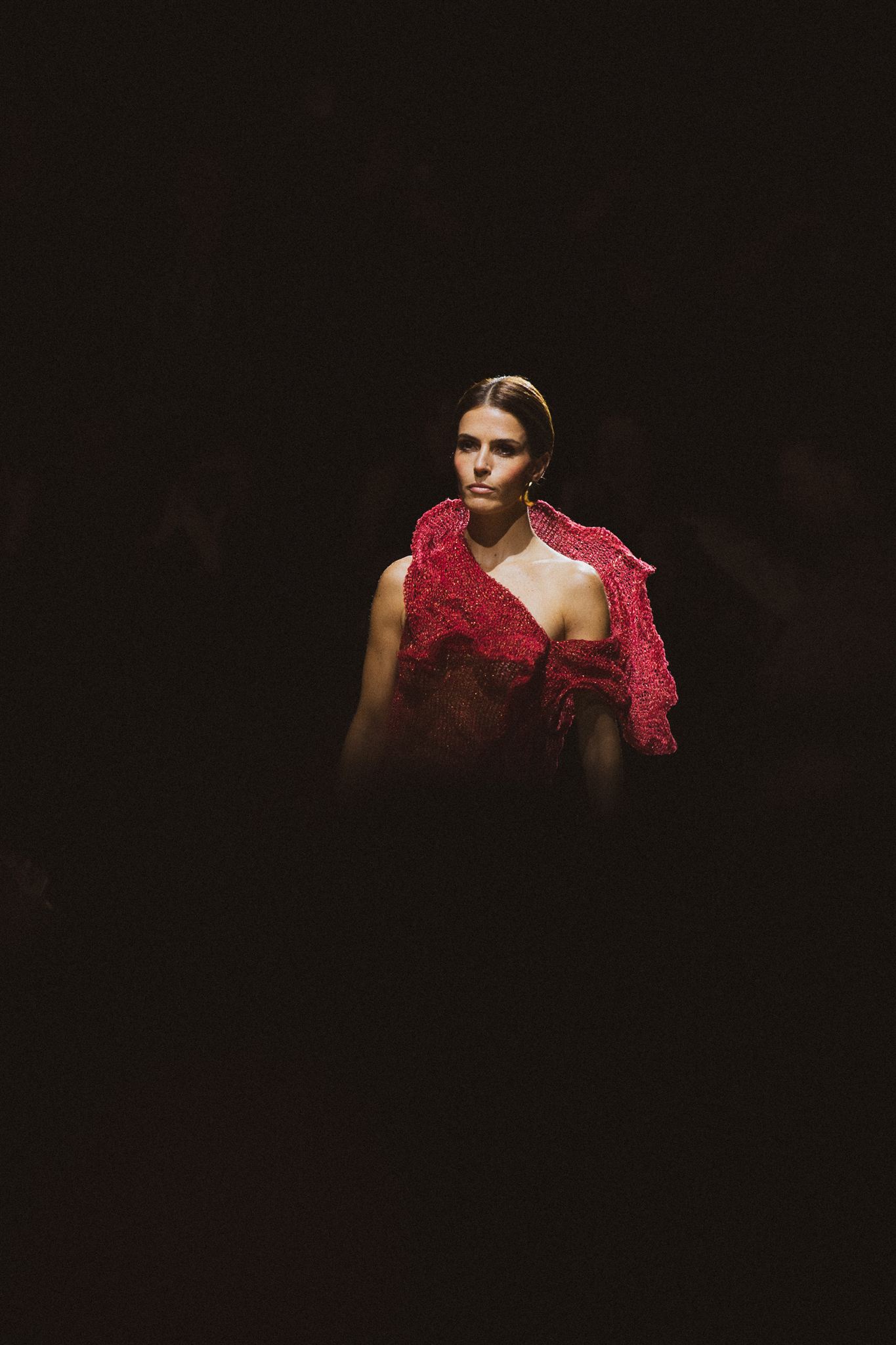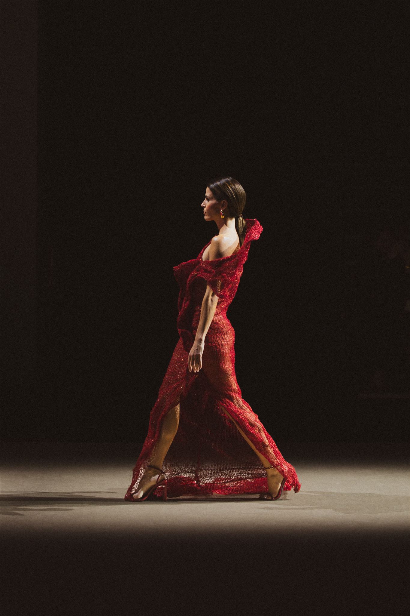 La paleta de color abarcó distintas tonalidades. Desde negros y marrones oscuros, pasando por azules y verde profundo, hasta una base de neutros y el icónico rojo intenso que desfiló Claudia Álvarez.