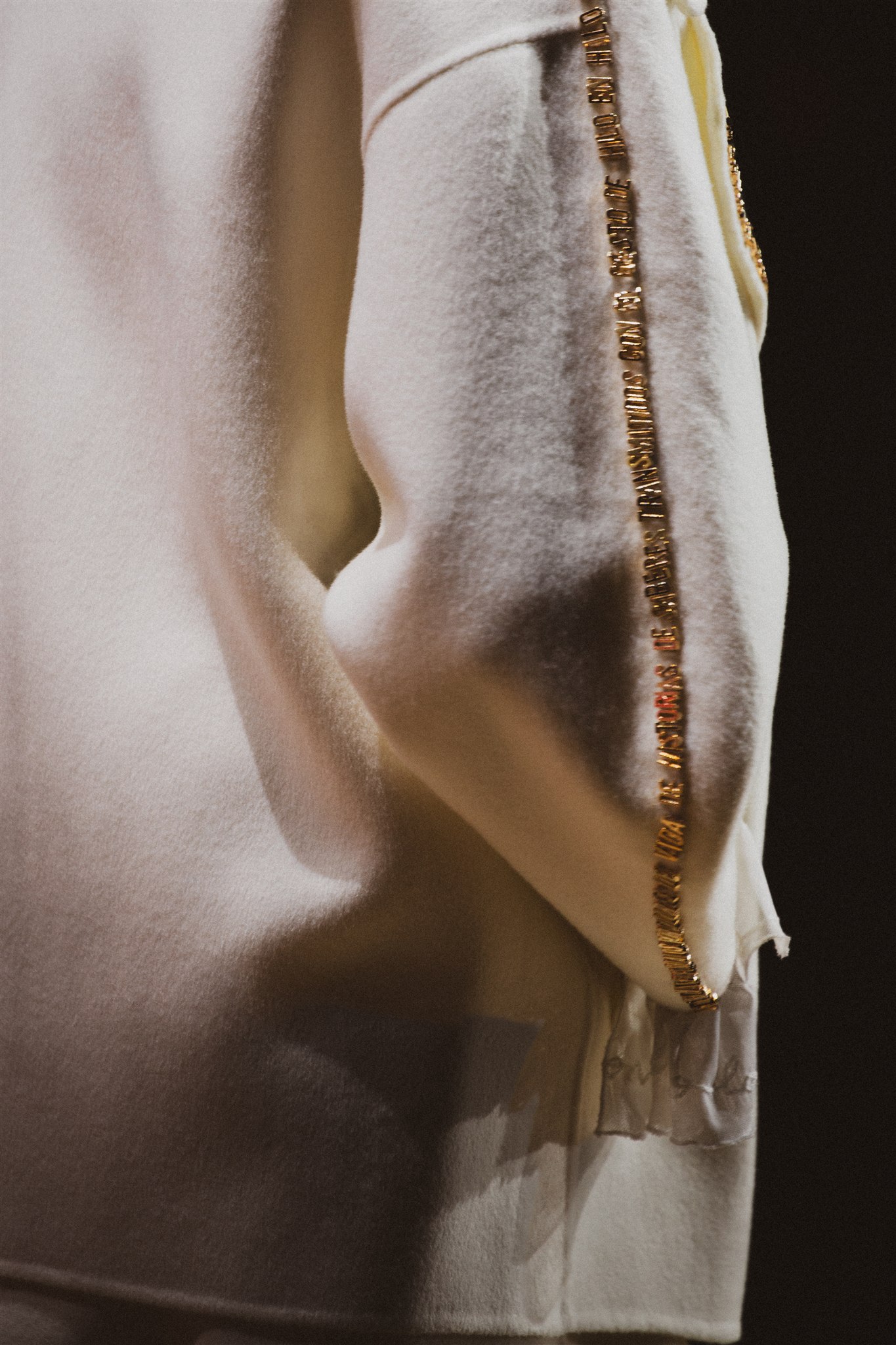 Caligrafías bordadas a mano, en algunos diseños visibles y otras veces ocultas. Tiras de texto impreso en napa, entrelazadas como lo hacen los hilos, recordando que así como las palabras, los tejidos también se construyen. Microcaracteres metálicos bordados a través de las costuras.