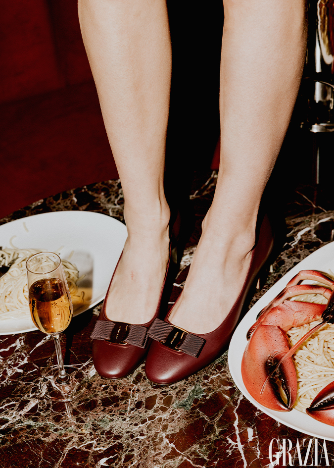 LOVE ME OR NOT Vestido en seda y zapatos Vara Bow, Ferragamo.