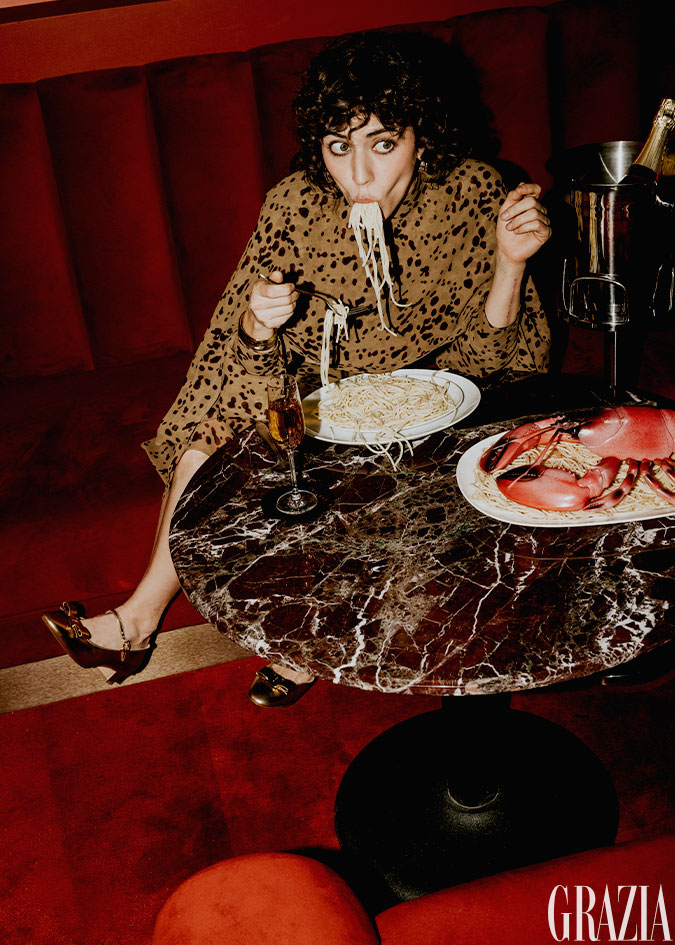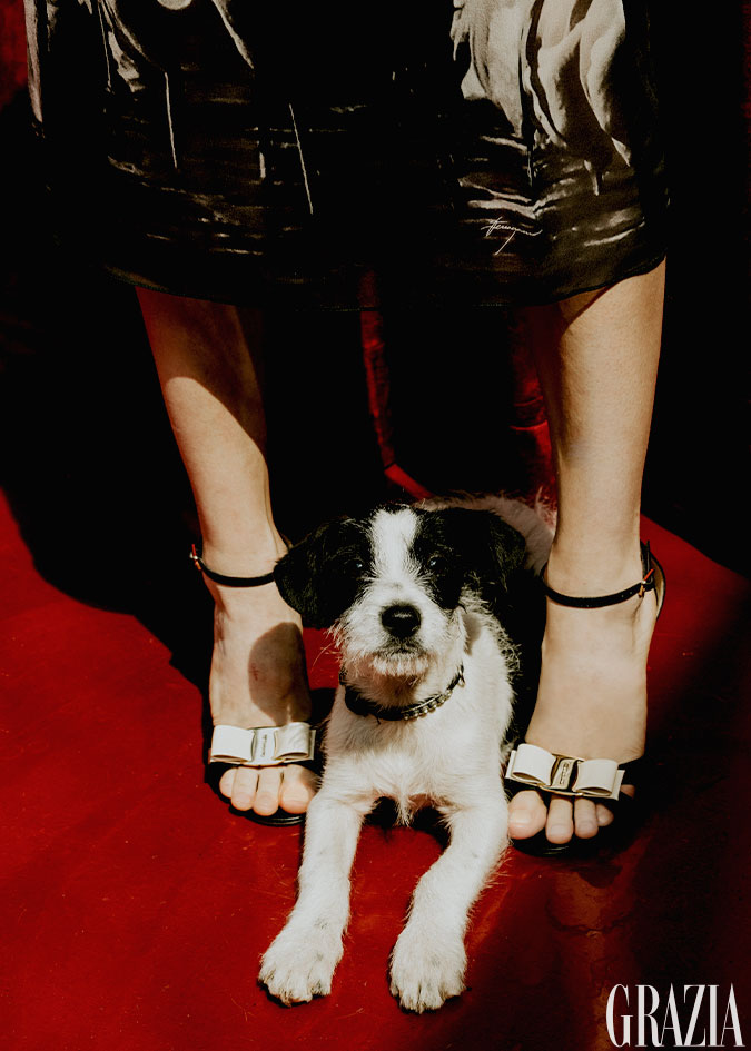 Vestido en seda, zapatos Vara Bow, Ferragamo.
