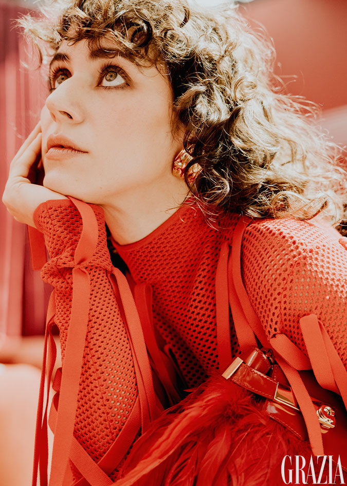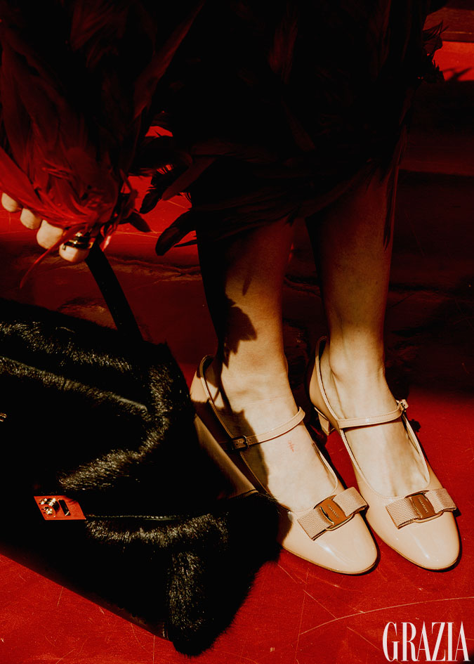 de plumas, aretes y zapatos Vara Bow, todo, Ferragamo.