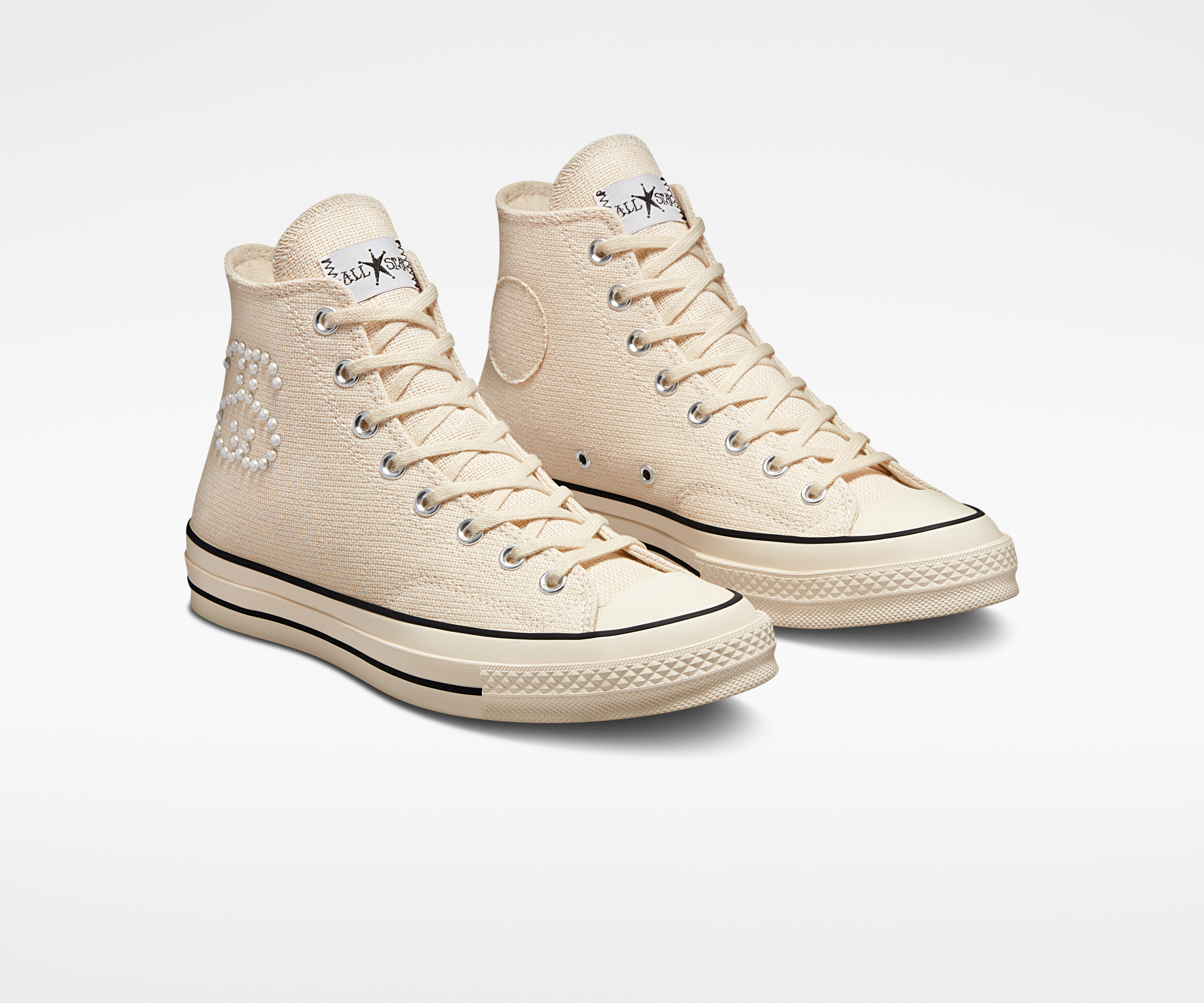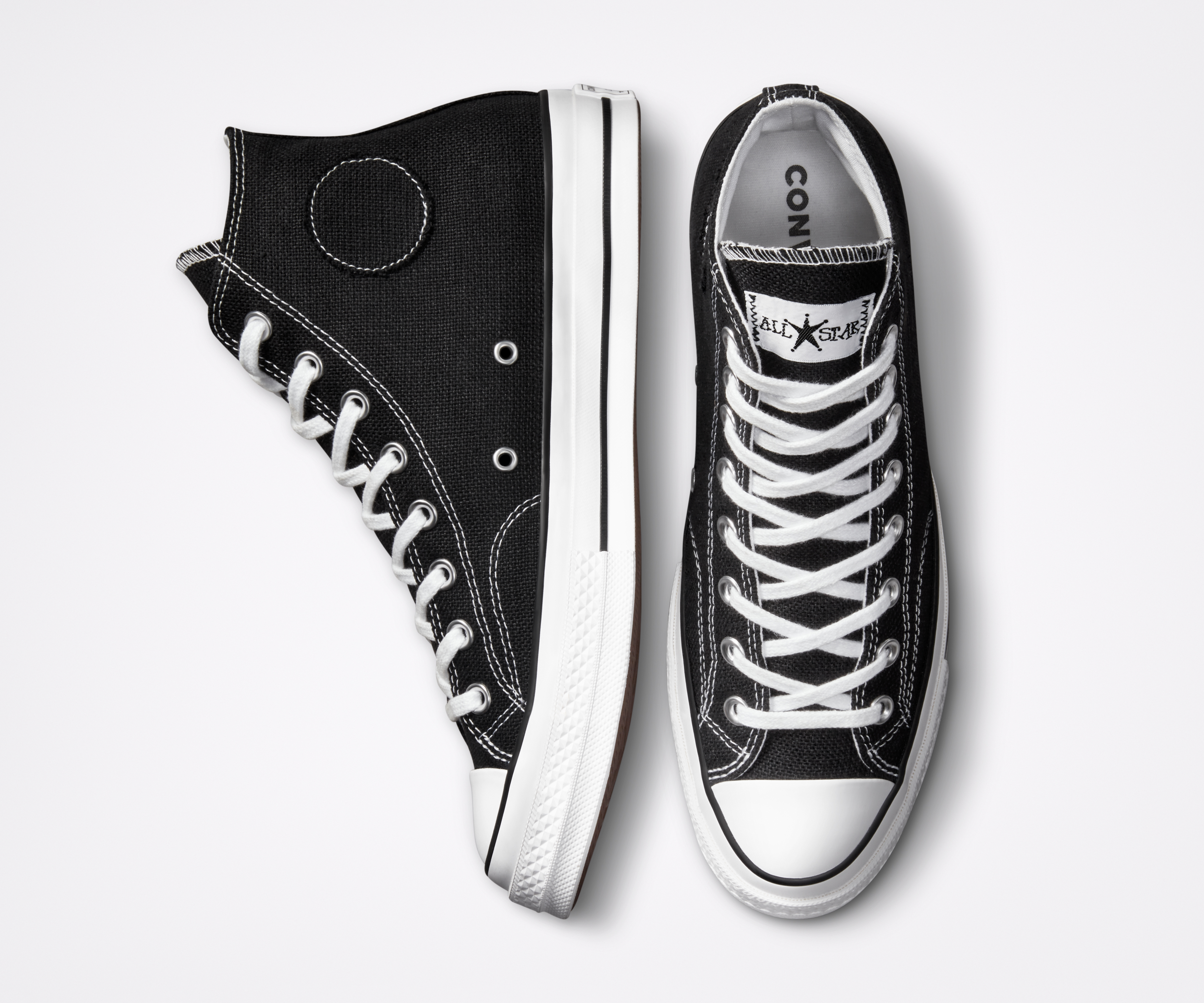 La marca de Stüssy se comprometió a producir ropa relevante y de buena calidad a precio razonable disponible en tiendas selectas y cantidades limitadas. Desde entonces se ha utilizado con diversos grados de éxito, como este Chuck 70, hecho 100% de cáñamo color natural, mientras que el diseño Stüssy ‘Double S’ es creado por medio de piezas en forma de perlas. Ambos cuentan con un parche interior oculto y una etiqueta tejida Stüssy “ALL STAR” en la lengüeta.