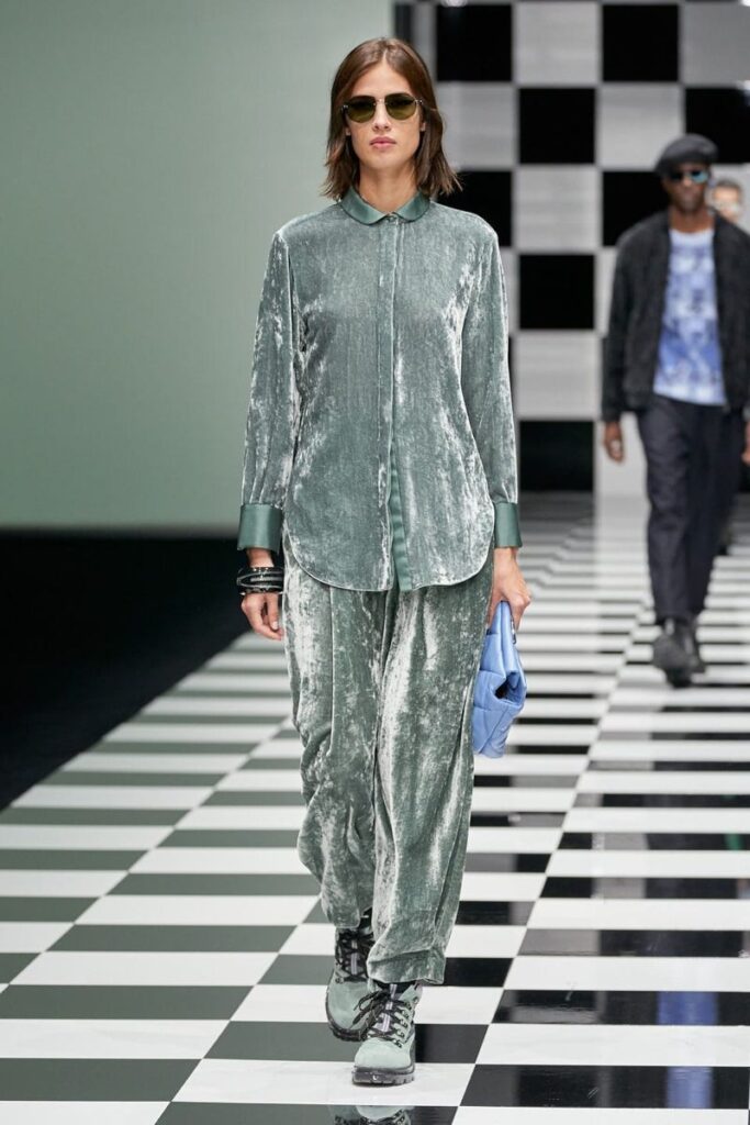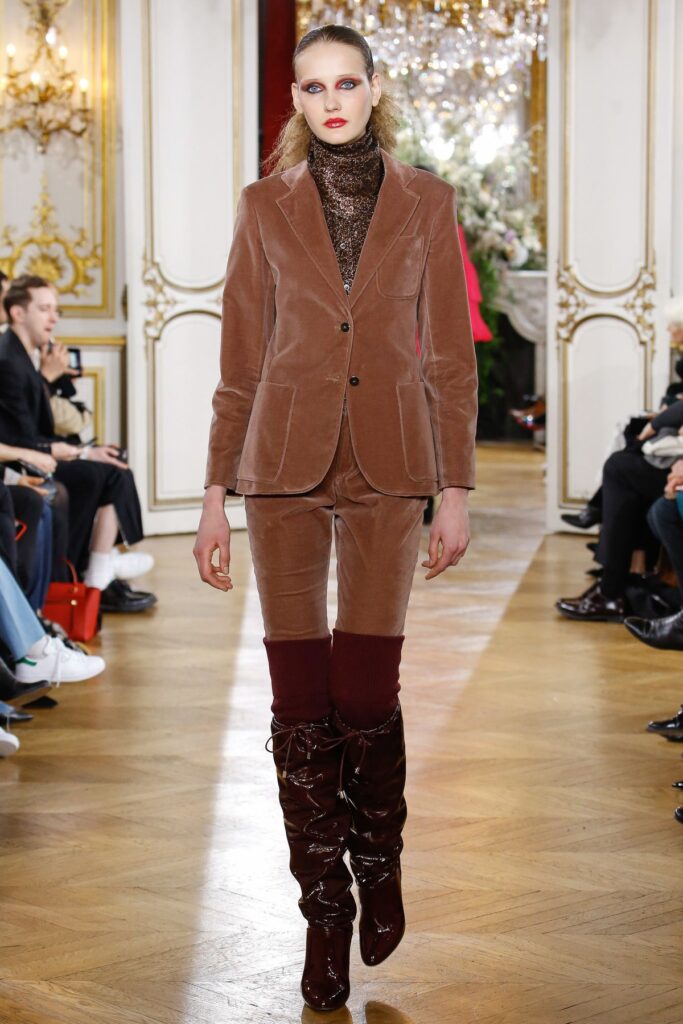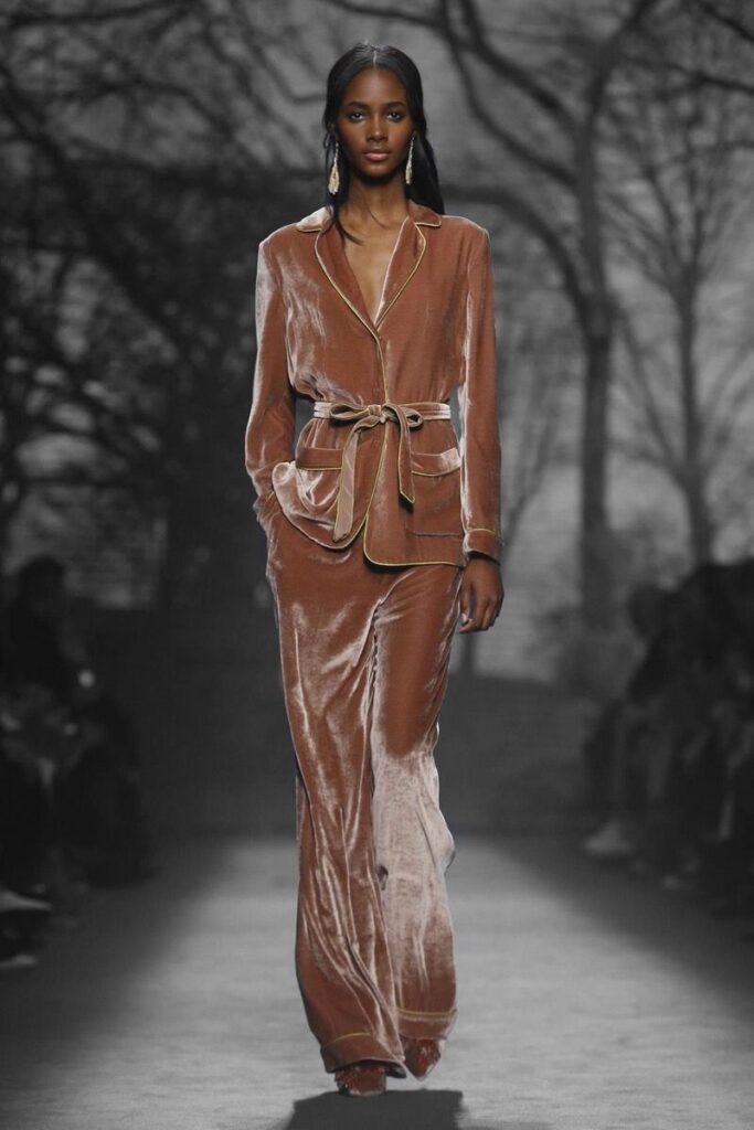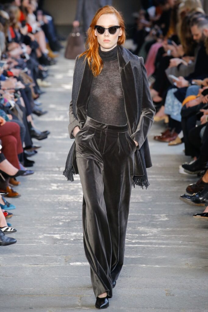 El pantalón de corte sastre en terciopelo demuestra que esta textura también funciona en el día a día con elegancia.
