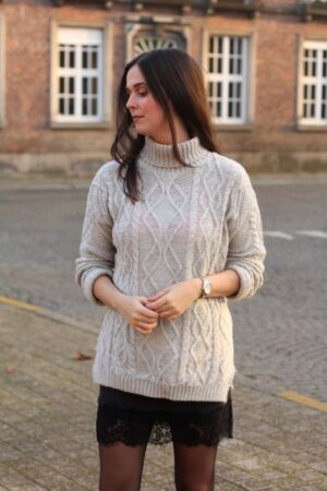Uno de los estilos más representativos de la temporada combina la falda lencera satinada en tono claro con un sweater de punto ajustado y botas altas. Esta composición articula la fluidez del satín con la textura densa del tejido.