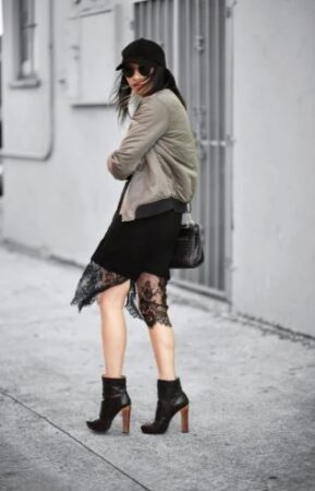 La falda lencera en negro satinada funciona como base neutra para un look urbano cuando se combina con una chamarra bomber oversize y botas hasta la rodilla.