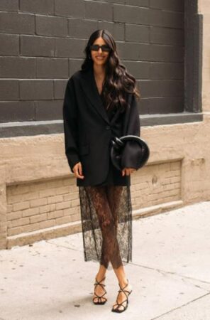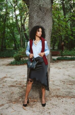 Este look aprovecha la tendencia de atar un sweater ligero alrededor de los hombros para introducir un punto dinámico sobre una falda lencera. Completado con accesorios como pulseras gruesas y bolsos, este conjunto demuestra cómo la falda satinada puede funcionar como pieza central.