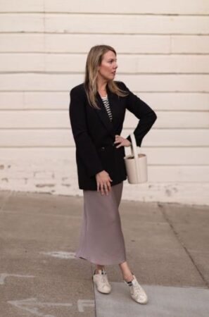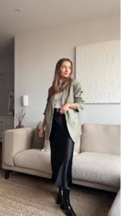 La falda satinada en tonos grises, cuando se acompaña de un blazer más neutral y un bolso formal, se ve muy chic para una reunión no tan casual.
