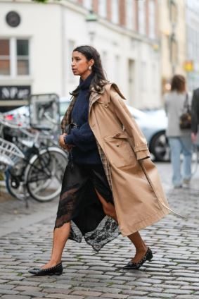 En un giro más relajado, la falda satinada larga se integra con una gabardina larga y tenis, logrando un outfit ideal para pasar por la ciudad con todo el estilo.