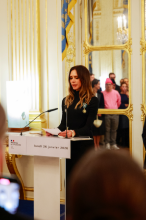 Fue el lunes 26 de enero que Rachida Dati, ministra de cultura francesa, colocó una cinta verde y un medallón en el vestido negro de Beckham, condecorándola como “Caballero de la Orden de las Artes y las Letras”, en una ceremonia celebrada al final del primer día de la Semana de la Alta Costura de París.