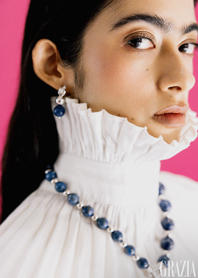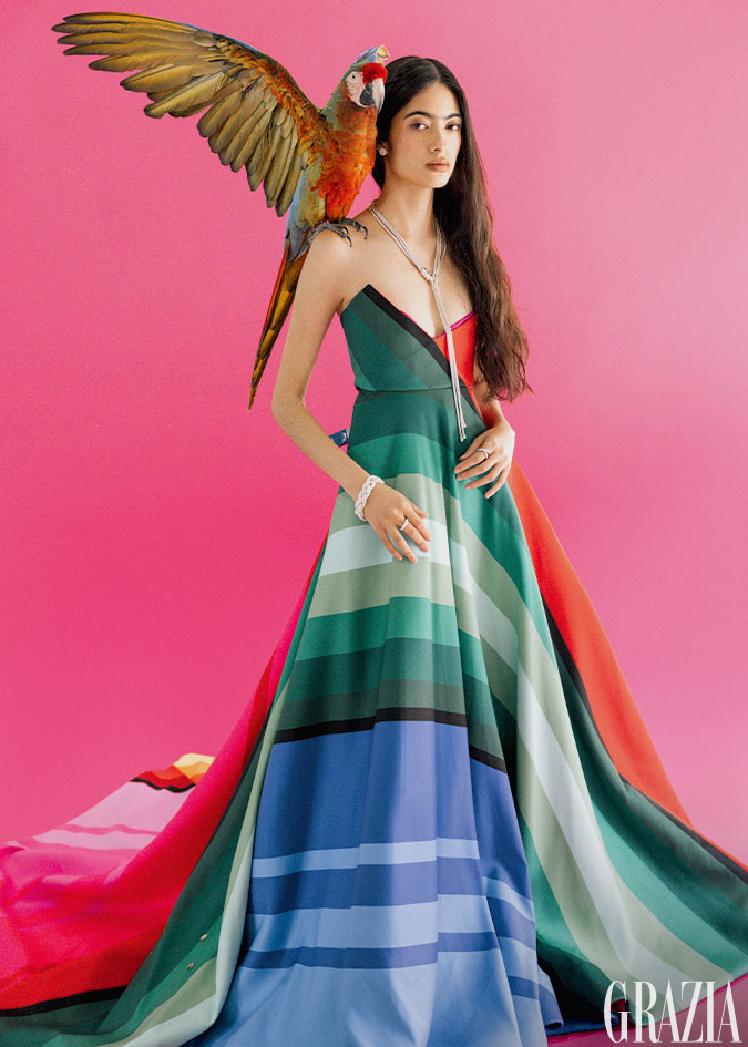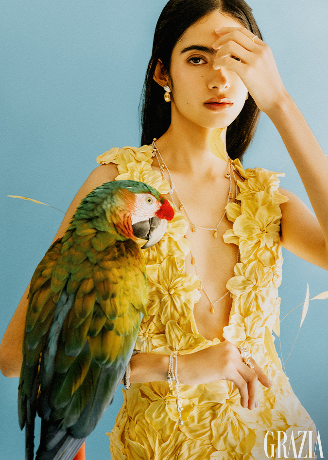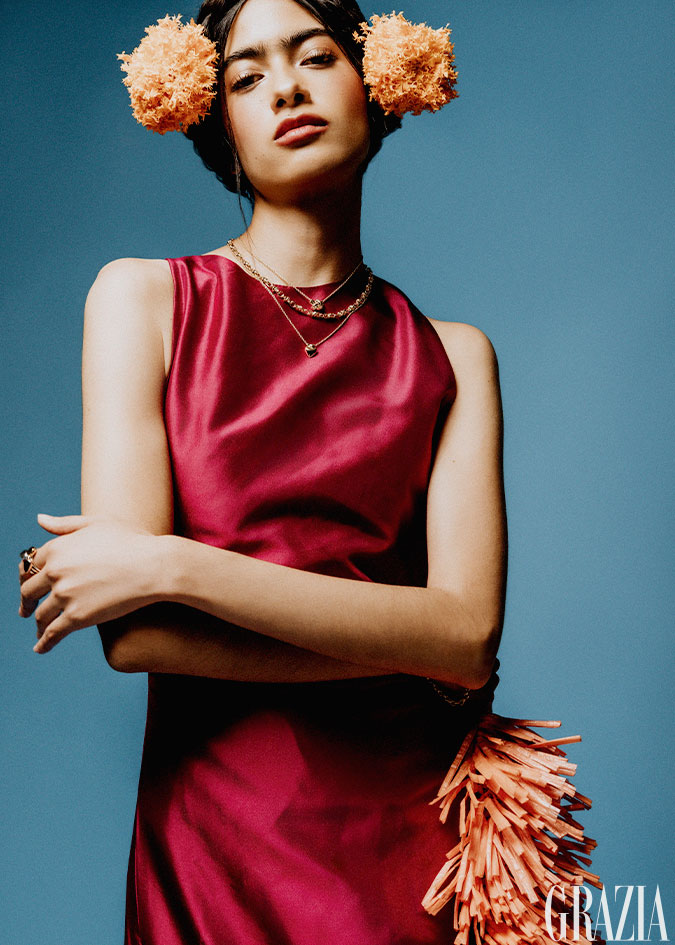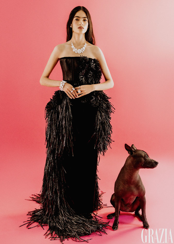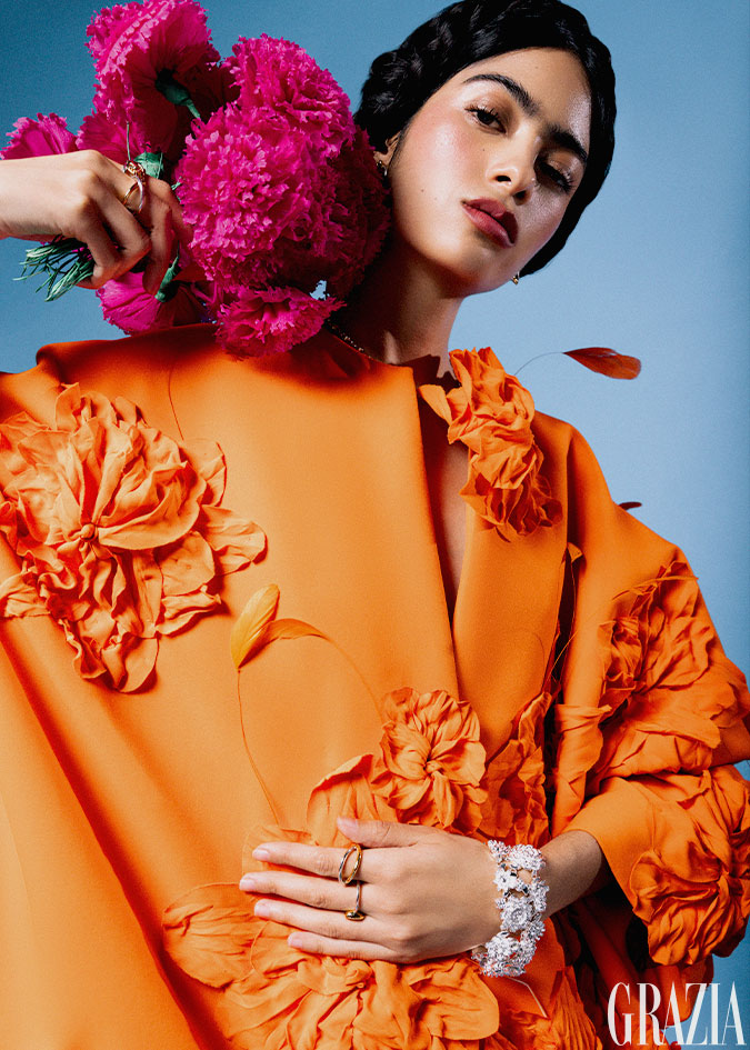 Vestido con aplicaciones en pluma, Raquel Orozco. Aretes Alma Maizal; collar y pulsera Alma; anillo en plata, Alma Grande; anillo Alma Vermeil y anillo Alma Triada, todo TANE.