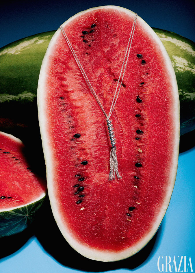 DUALIDAD MISTERIOSA Saco en rafia, Iván Ávalos. Aretes y dije Lazos Infinito; collar y anillo Trenza; anillo Lazos Torzal y anillo Xocolate Fondant Diamantes, todo TANE.