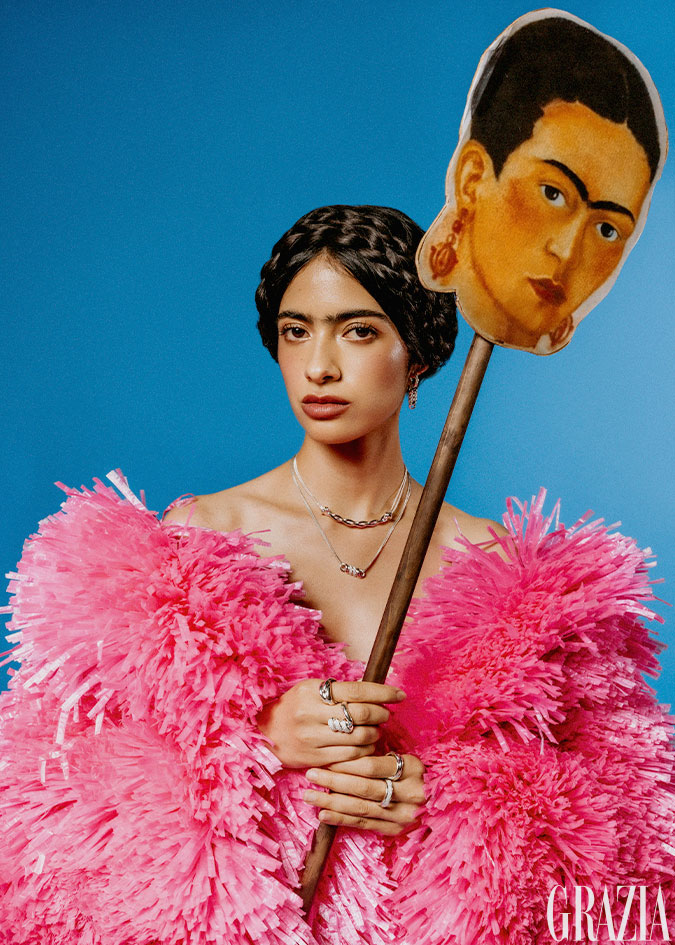 Saco, Raquel Orozco. Pulsera para Frida Kahlo®; anillo X; anillo Alma Vermeil y anillo Tengo Alas, todoTANE.