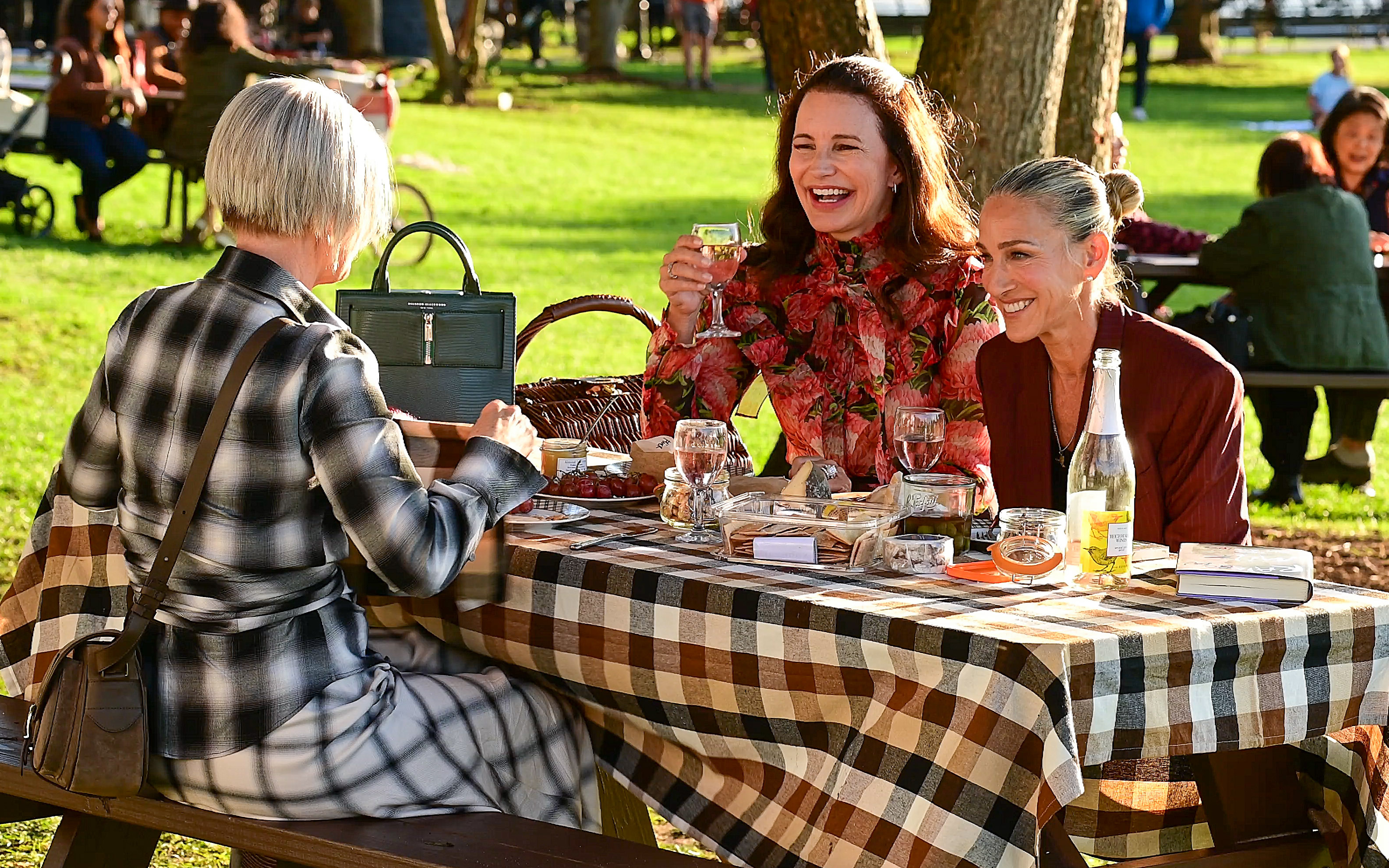Coming together for a picnic in the park, our favorite trio experience a wealth of revelations. With Carrie expertly working a vintage Gucci wine-colored pinstriped oversized tailored suit, she of course paired the look with Manolo Blahnik black “BB” leather pumps.
