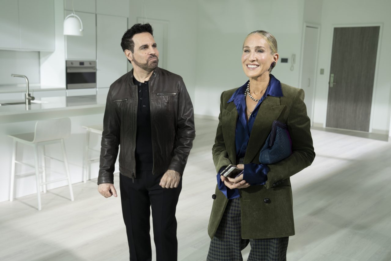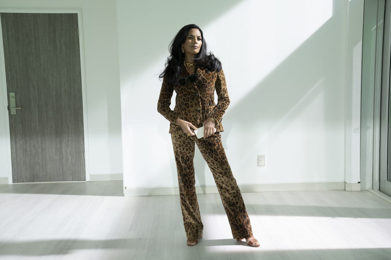 As Carrie contemplates leaving her “perfectly worn-in cashmere sweater of apartments” behind, she winds up buying an ultra-modern, palatial downtown flat filled with natural light. Resembling Halston’s iconic showroom, Carrie dons a nightingale-brown velvet blazer over a marine blue silk button-down, with matching checkered trousers, knee-high boots, and a blue and pink color-blocked croc clutch to scope the place out with Anthony and Seema. Taking a walk in the wild side, Seema owns the room (as usual) in her velvet leopard print Etro suit for the final walk-through.