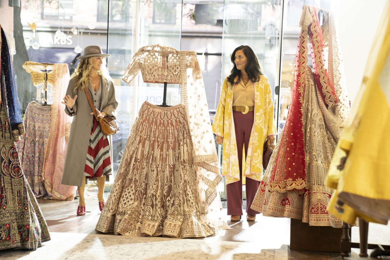 Ready for Seema’s family Diwali celebration, Carrie dons a traditional Indian garment. Opting for Falguni Shane Peacock’s intricately embroidered “Lekha” lehenga set, Carrie finishes off her look with floral fuschia hair accessories throughout her long braid. Seema, on the other hand, sports Tarun Tahiliani’s printed organza sari with a fitted gold top beneath.