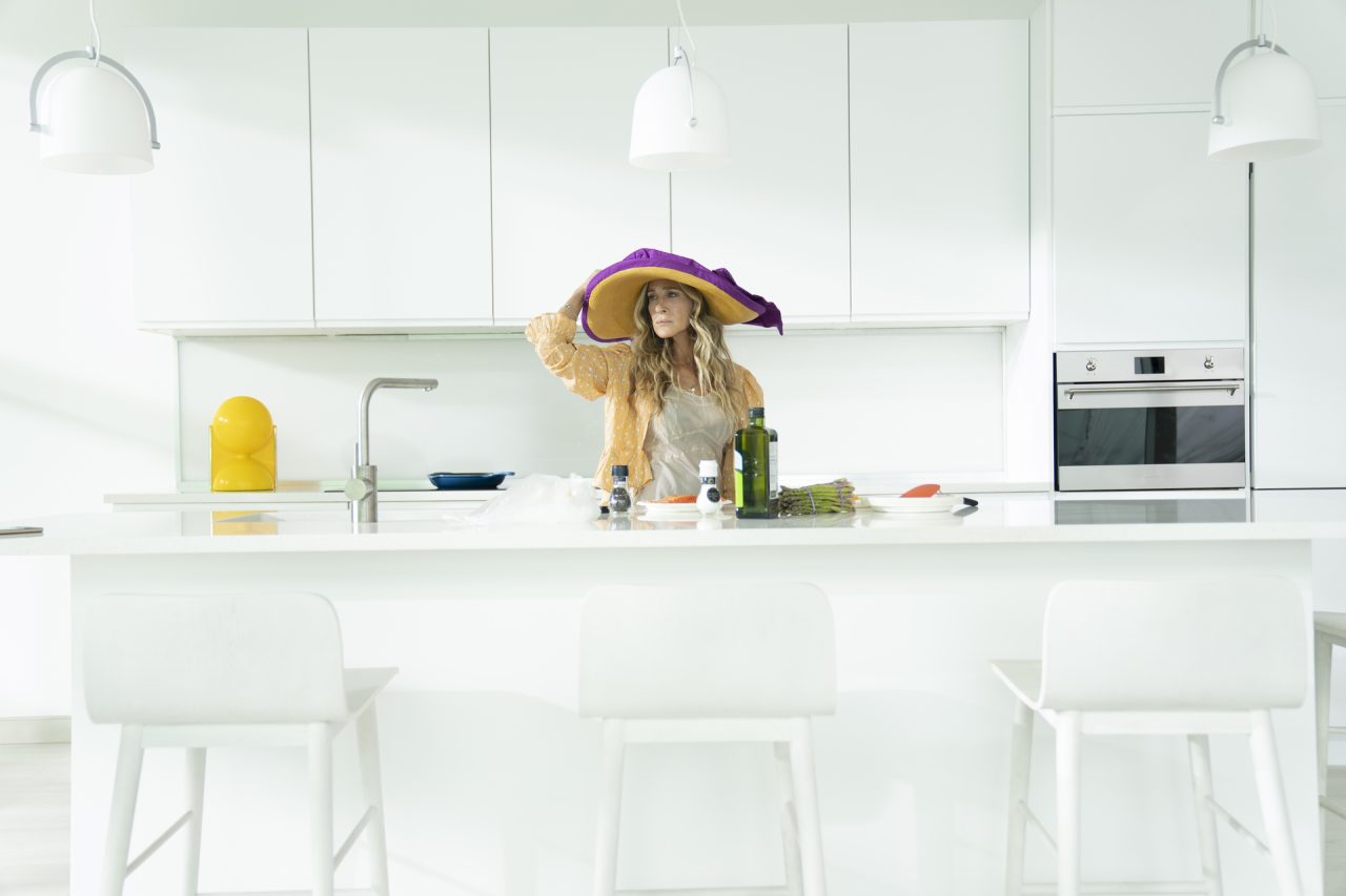 Sparking both joy and two major millinery moments, Carrie and Charlotte go through Carrie’s storage unit, leaving only with a hat, a lamp, and a frying pan, once it gets a bit too emotional. As Charlotte advises Carrie to channel the expertise of Marie Kondo, Carrie discovers her favorite sunhat packed away, noting that now, with all of her windows and natural light, “she’s not just fashion- she’s survival.”