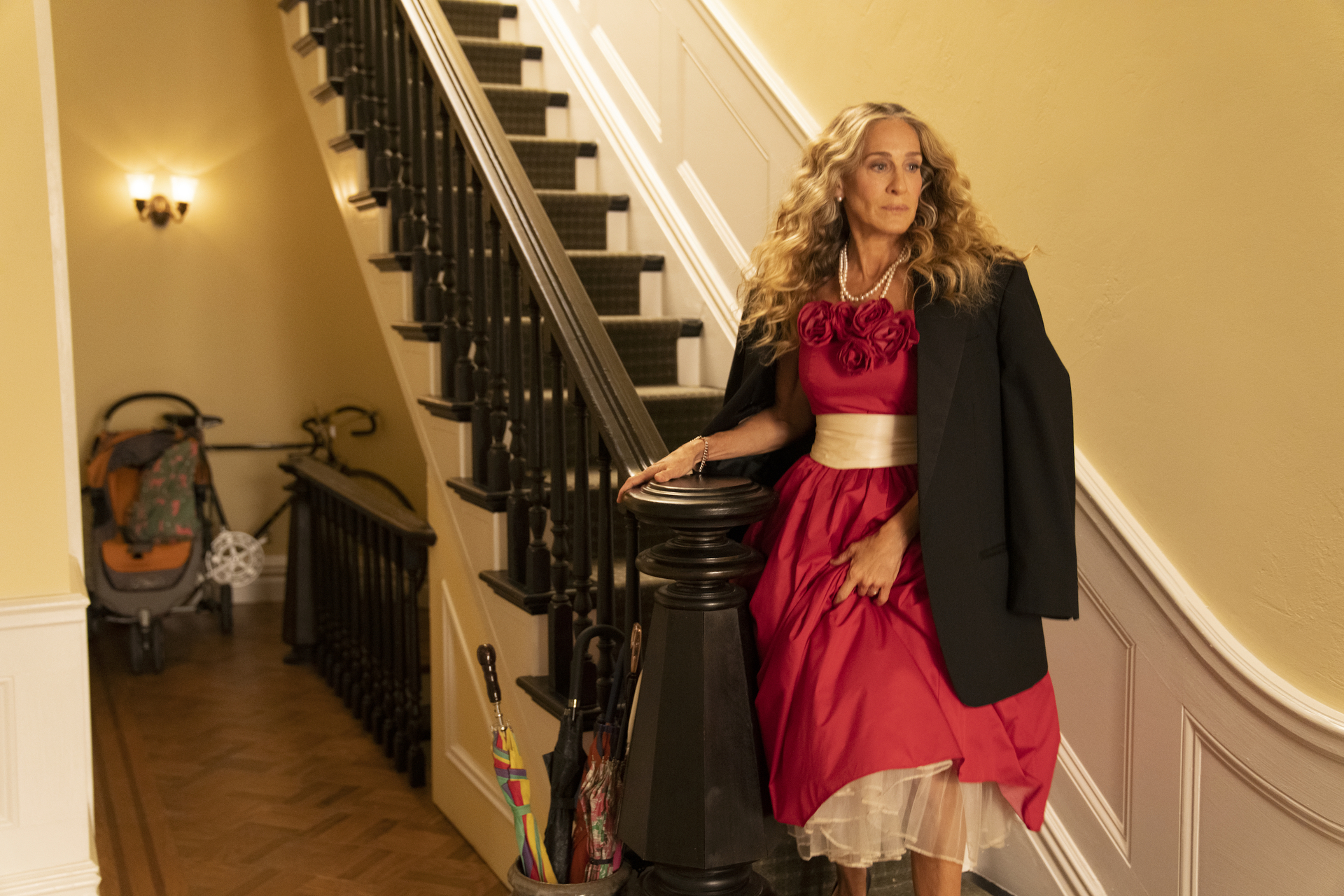 After realizing that she doesn’t need a face lift and admitting that the spacious and modern downtown loft is not for her, she emerges from her iconic apartment in a quintessentially Carrie look. Donning pearls and voluminous red midi dress with rose bust appliques beneath one of Big’s blazers, her ensembles exemplifies the character’s style identity, symbolizing a form of closure in Big’s unexpected death, and acceptance of who she is.